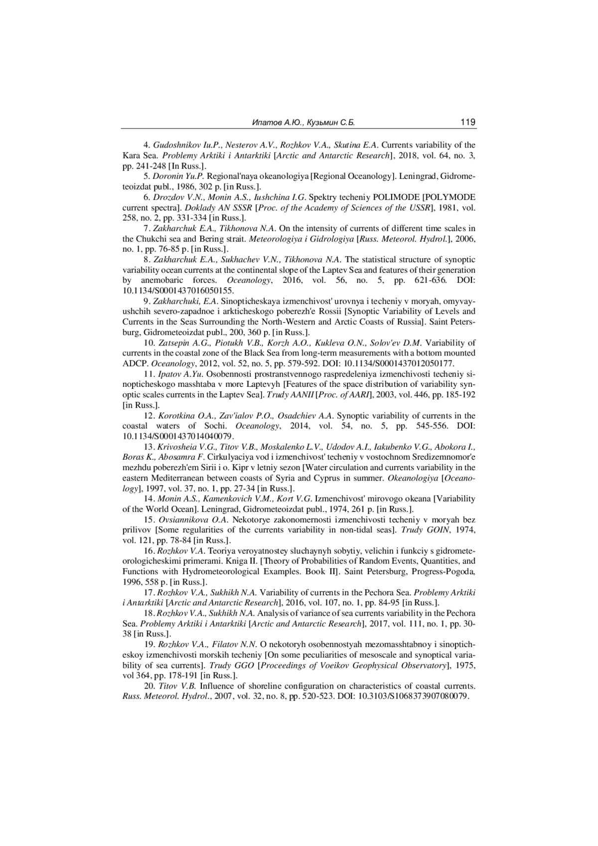 4. Гудошников Ю.П., Нестеров А.В., Рожков В.А., Скутина Е.А. Изменчивость течений Карского моря // Проблемы Арктики и Антарктики. 2018. Том 64, № 3. С. 241-248. EDN: YQINPF