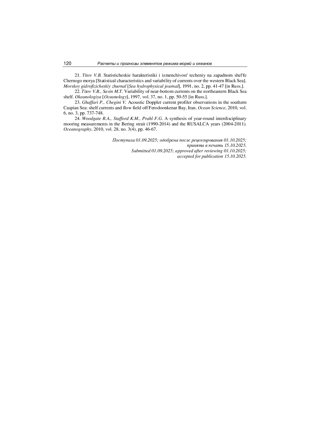 22. Титов В.Б., Савин М.Т. Изменчивость придонных течений на северо-восточном шельфе Черного моря // Океанология. 1997. Том 37, № 1. С. 50-55.