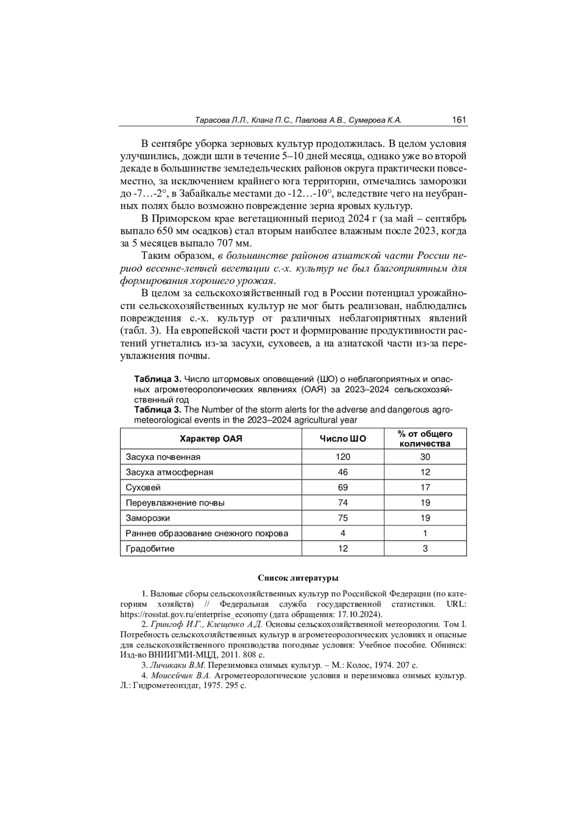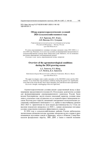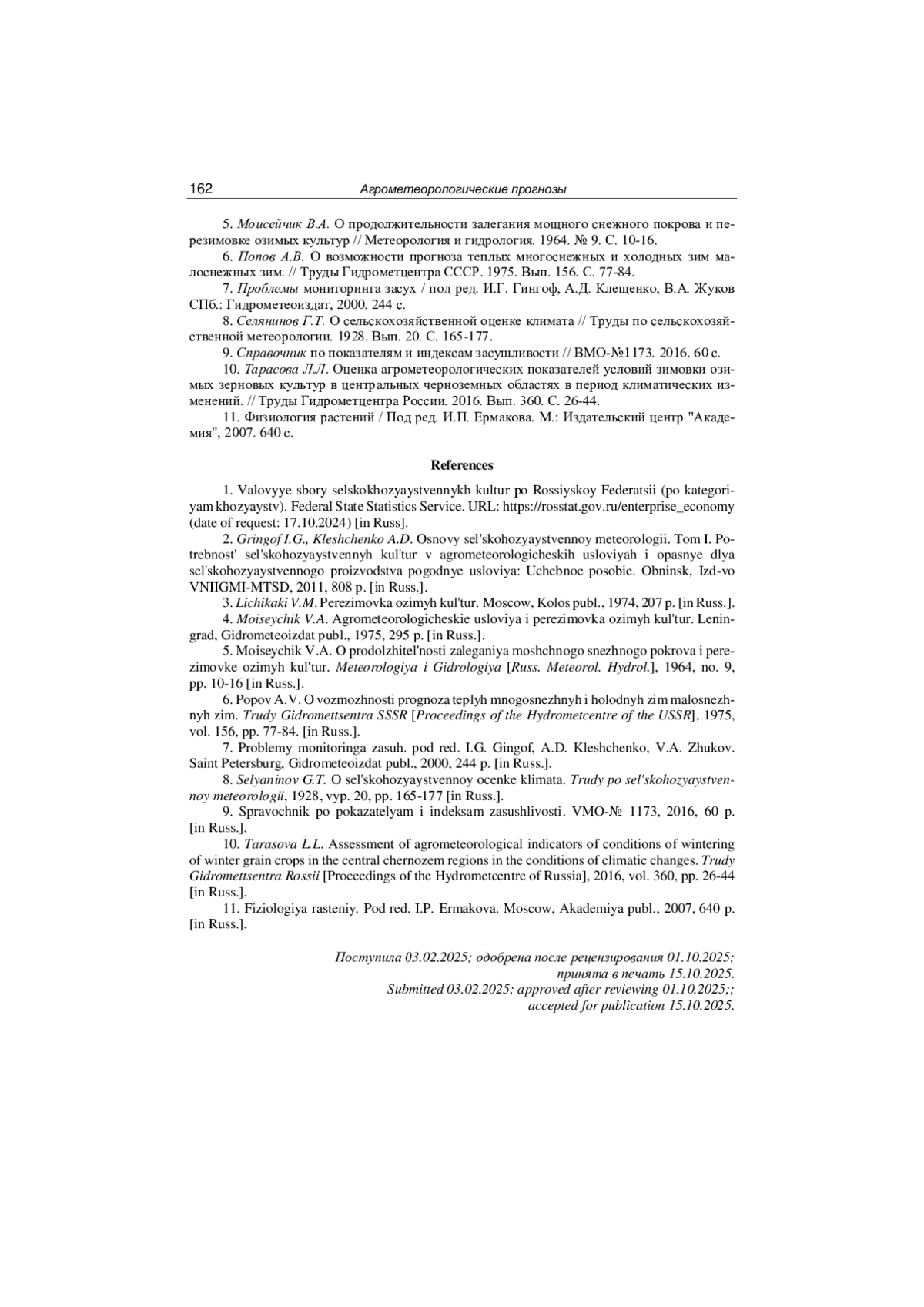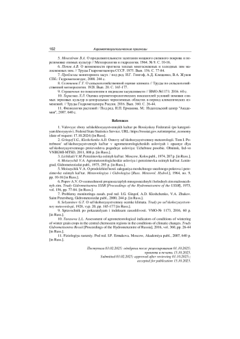 10. Тарасова Л.Л. Оценка агрометеорологических показателей условий зимовки озимых зерновых культур в центральных черноземных областях в период климатических изменений. // Труды Гидрометцентра России. 2016. Вып. 360. С. 26-44.