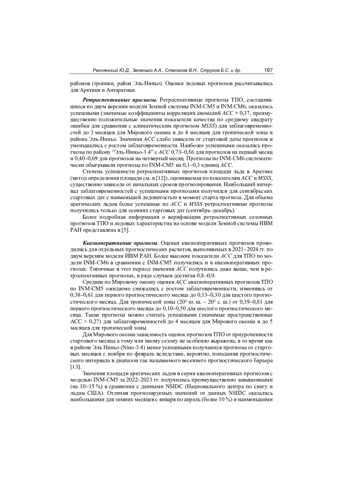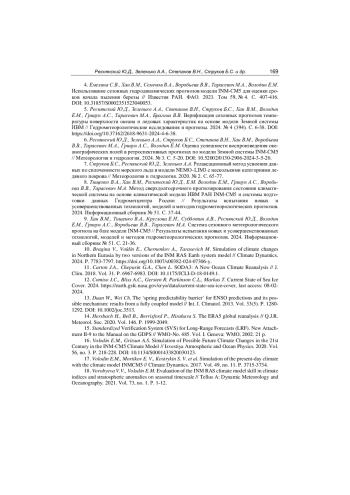 6. Реснянский Ю.Д., Зеленько А.А., Струков Б.С., Степанов В.Н., Хан В.М., Воробьева В.В., Тарасевич М.А., Грицун А.С., Володин Е.М. Оценка успешности воспроизведения океанографических полей в ретроспективных прогнозах по модели Земной системы INM-CM5 // Метеорология и гидрология. 2024. № 3. С. 5-20. DOI: 10.52002/0130-2906-2024-3-5-20 EDN: EIHLLO
