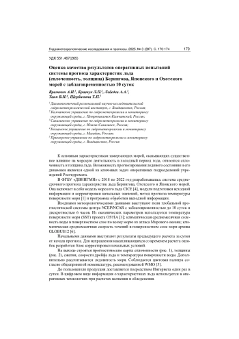 В ФГБУ «ДВНИГМИ» с 2018 по 2022 год разрабатывалась система среднесрочного прогноза характеристик льда Берингова, Охотского и Японского морей. Она включает в себя модель морского льда CICE [4], модули подготовки исходной информации и корректировки начальных значений, метод прогноза температуры поверхности моря [1] и программы обработки выходной информации. Входными метеорологическими данными выступают поля глобальной прогностической системы центра NCEP/NCAR с заблаговременностью до 10 суток и дискретностью 6 часов. Из океанических параметров используется температура поверхности моря (SST) проекта OSTIA [3]; климатическая среднемесячная соленость воды в поверхностном слое по всему морю из атласа Мирового океана; климатическая среднемесячная скорость течений в поверхностном слое моря архива GLOBUS12 [6].