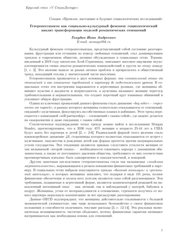 Голудин, И. А. Гетеропессимизм как социально-культурный феномен: социологический анализ трансформации моделей романтических отношений / И. А. Голудин // СоциоДискурс. Современные тенденции развития социальных наук : материалы V Всерос. круглого стола для студентов, аспирантов и молодых ученых, Москва, 2025 г.
