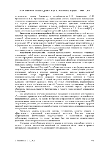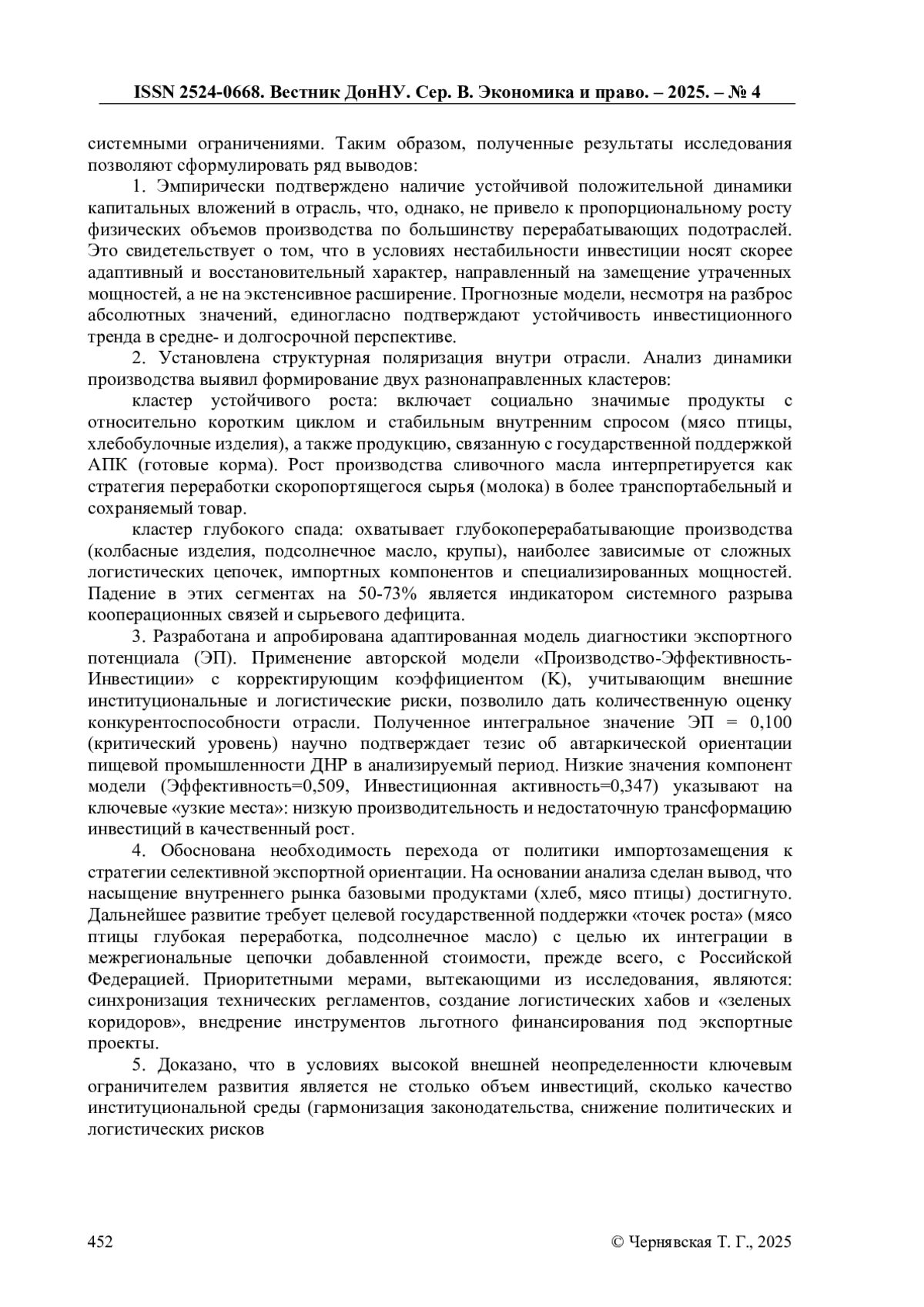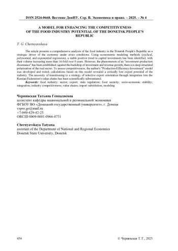 В статье проведён комплексный анализ пищевой промышленности Донецкой Народной Республики как стратегического драйвера экономики в условиях кризиса. Методами эконометрического моделирования (циклическая, полиномиальная и экспоненциальная регрессии) выявлена устойчивая положительная динамика капитальных вложений, объём которых за 9 лет вырос более чем в 16 раз. Однако установлен феномен «инвестиционно-производственного диссонанса»: на фоне роста инвестиций и выручки наблюдается глубокая структурная поляризация реального сектора. Для оценки конкурентоспособности разработана и апробирована авторская модель «Производство-Эффективность-Инвестиции», расчёт по которой показал критически низкий экспортный потенциал отрасли. Научно обоснована необходимость перехода к стратегии селективной экспортной ориентации через интеграцию в цепочки добавленной стоимости Российской Федерации.