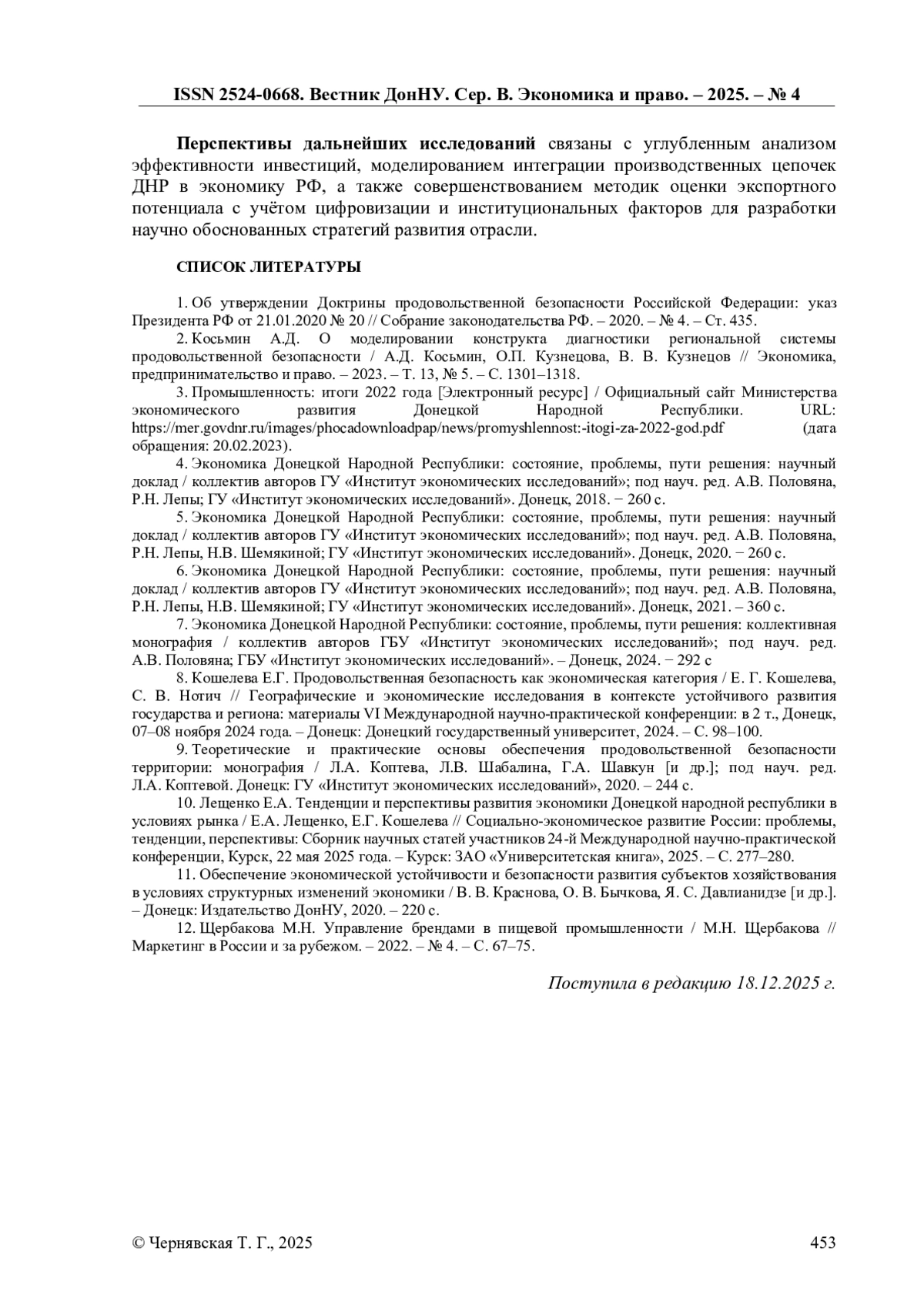 8. Кошелева Е.Г. Продовольственная безопасность как экономическая категория / Е. Г. Кошелева, С. В. Нотич // Географические и экономические исследования в контексте устойчивого развития государства и региона: материалы VI Международной научно-практической конференции: в 2 т., Донецк, 07-08 ноября 2024 года. - Донецк: Донецкий государственный университет, 2024. - С. 98-100. EDN: TXXBCT