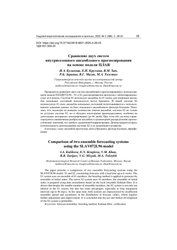 Проводится сравнение двух систем ансамблевого прогнозирования с использованием модели ПЛАВ072L96 - S1 и S2, рассматриваются прогнозы с заблаговременностью до 6 недель. Система S1 использует ансамбль из 61 члена, для генерации ансамбля начальных состояний используется метод бридинга. В новой системе S2 используется 41 член, ансамбль начальных состояний подготавливается с использованием усвоения данных на базе локального ансамблевого фильтра Калмана. Показано, что, несмотря на меньшее количество членов ансамбля, система S2 не только не уступает системе S1, но и обладает некоторыми преимуществами, особенно на длительных интервалах интегрирования (до 46 дней). При этом обе системы характеризуются заниженным разбросом ансамбля и асимметрией распределения прогностических значений, что требует дальнейшей корректировки. Демонстрируется предпочтительность использования системы S2 и ее дальнейшего развития.