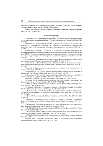 1. Астахова Е.Д. Ансамблевый среднесрочный прогноз погоды: реализация технологии на современной компьютерной базе // Труды Гидрометцентра России. 2011. Вып. 346. С. 38-52.