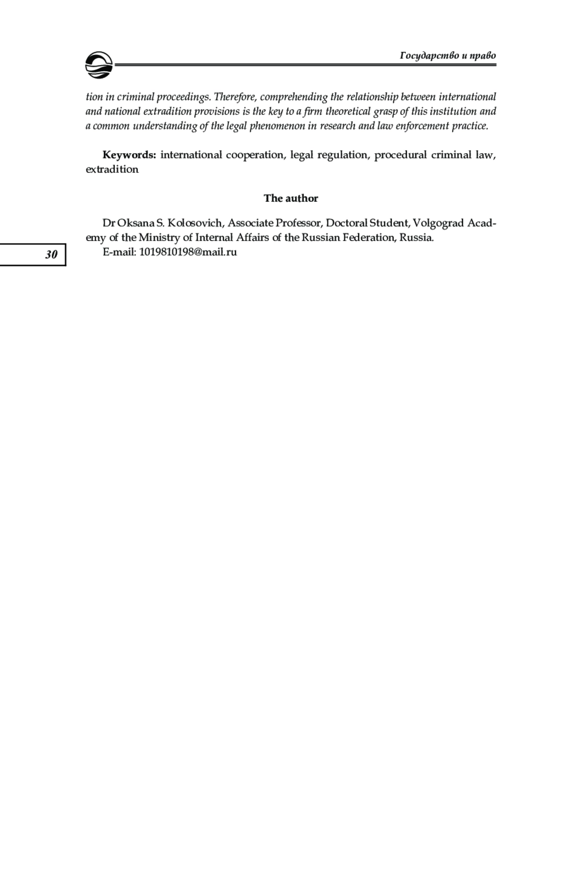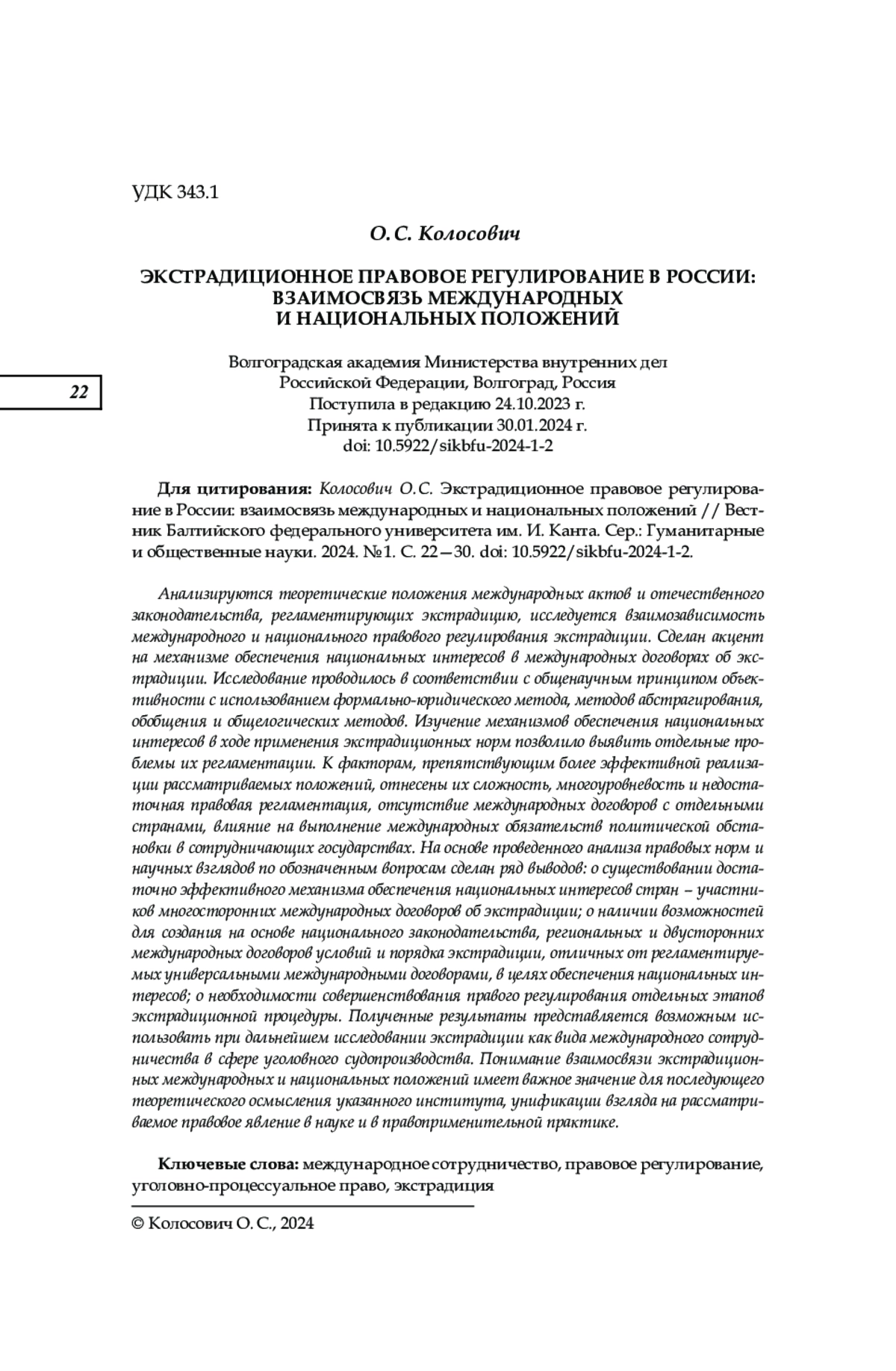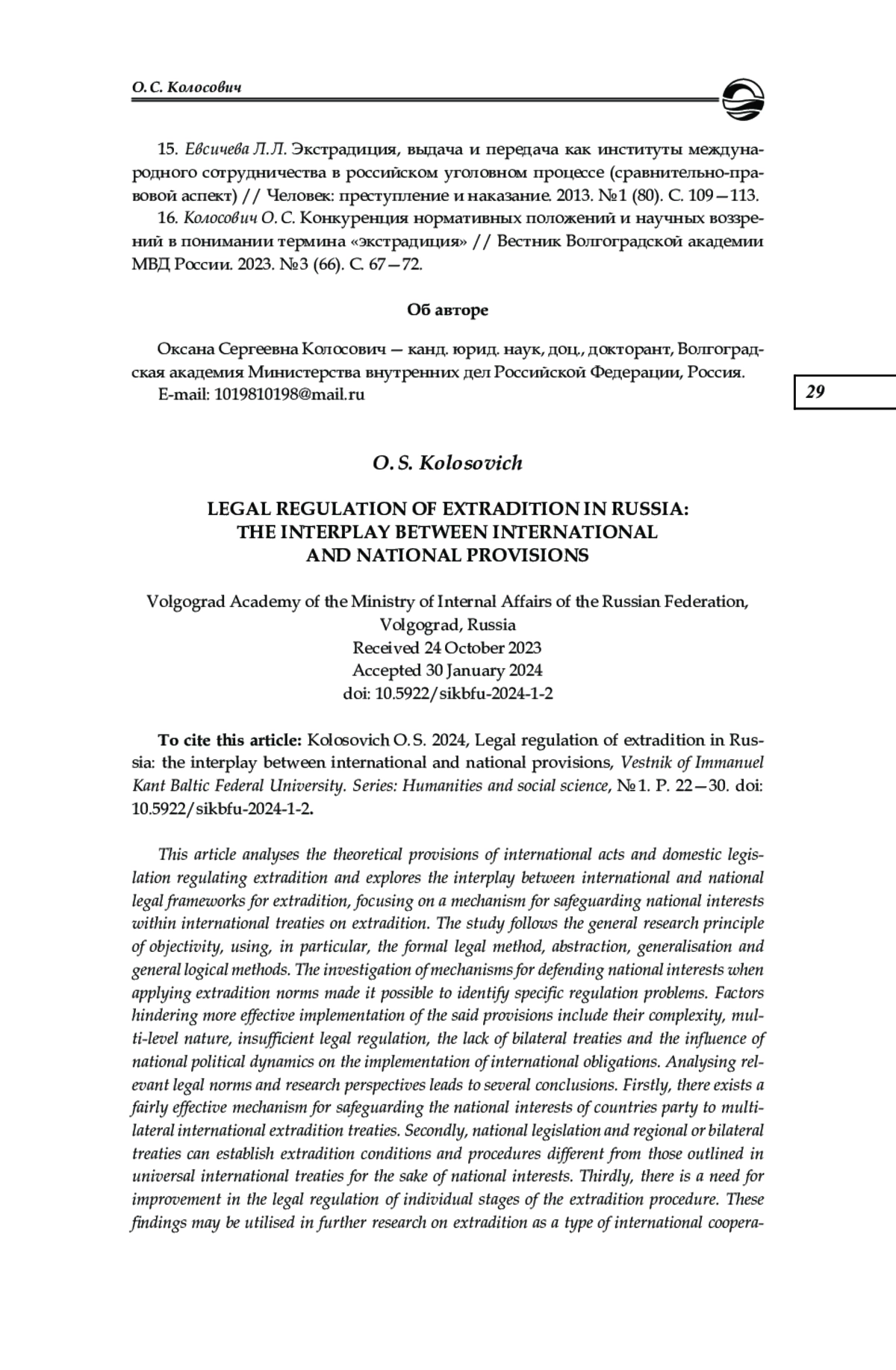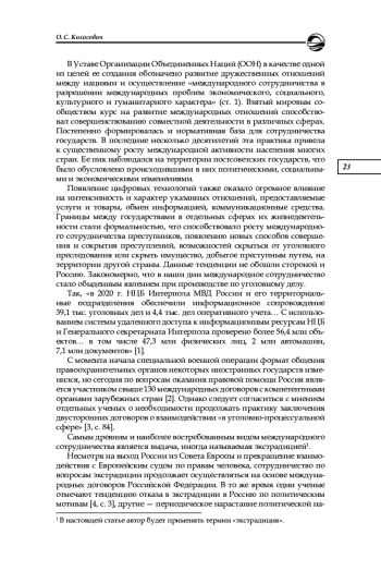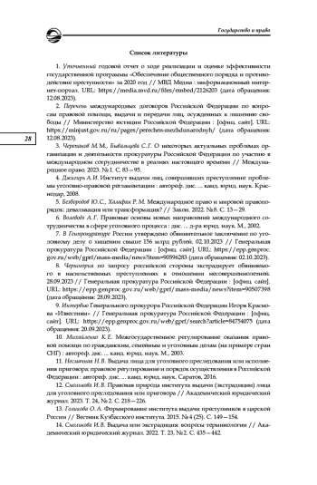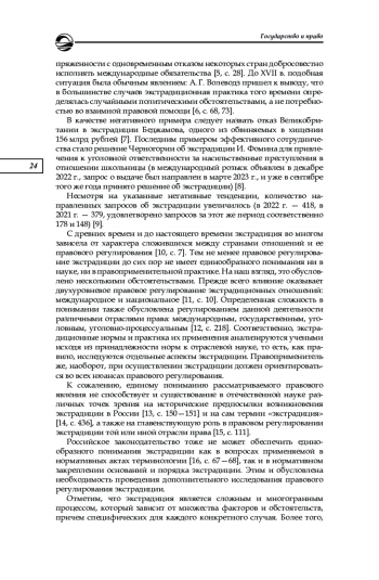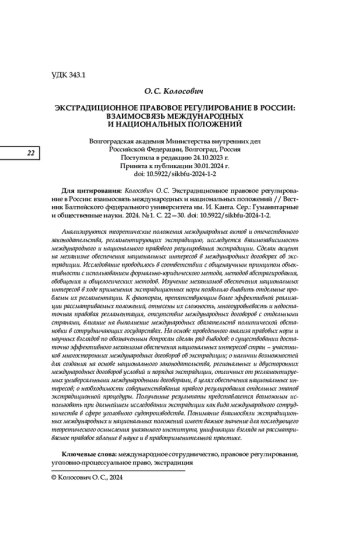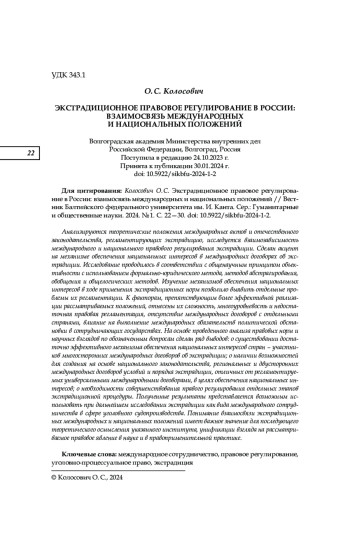 Анализируются теоретические положения международных актов и отечественного законодательства, регламентирующих экстрадицию, исследуется взаимозависимость международного и национального правового регулирования экстрадиции. Сделан акцент на механизме обеспечения национальных интересов в международных договорах об экстрадиции. Исследование проводилось в соответствии с общенаучным принципом объективности с использованием формально-юридического метода, методов абстрагирования, обобщения и общелогических методов. Изучение механизмов обеспечения национальных интересов в ходе применения экстрадиционных норм позволило выявить отдельные проблемы их регламентации. К факторам, препятствующим более эффективной реализации рассматриваемых положений, отнесены их сложность, многоуровневость и недостаточная правовая регламентация, отсутствие международных договоров с отдельными странами, влияние на выполнение международных обязательств политической обстановки в сотрудничающих государствах. На основе проведенного анализа правовых норм и научных взглядов по обозначенным вопросам сделан ряд выводов: о существовании достаточно эффективного механизма обеспечения национальных интересов стран — участников многосторонних международных договоров об экстрадиции; о наличии возможностей для создания на основе национального законодательства, региональных и двусторонних международных договоров условий и порядка экстрадиции, отличных от регламентируемых универсальными международными договорами, в целях обеспечения национальных интересов; о необходимости совершенствования правого регулирования отдельных этапов экстрадиционной процедуры. Полученные результаты представляется возможным использовать при дальнейшем исследовании экстрадиции как вида международного сотрудничества в сфере уголовного судопроизводства. Понимание взаимосвязи экстрадиционных международных и национальных положений имеет важное значение для последующего теоретического осмысления указанного института, унификации взгляда на рассматриваемое правовое явление в науке и в правоприменительной практике