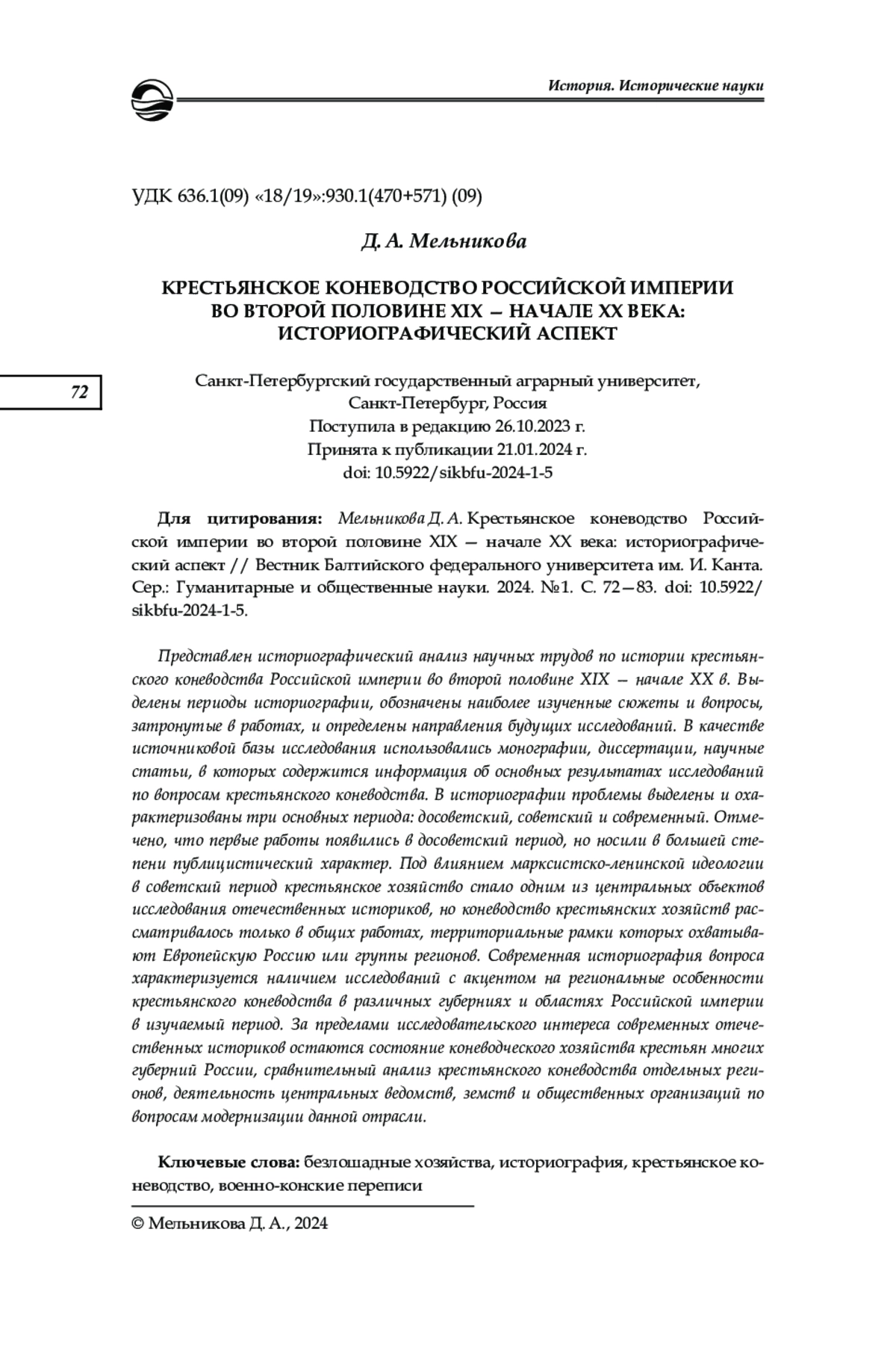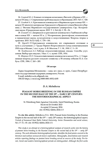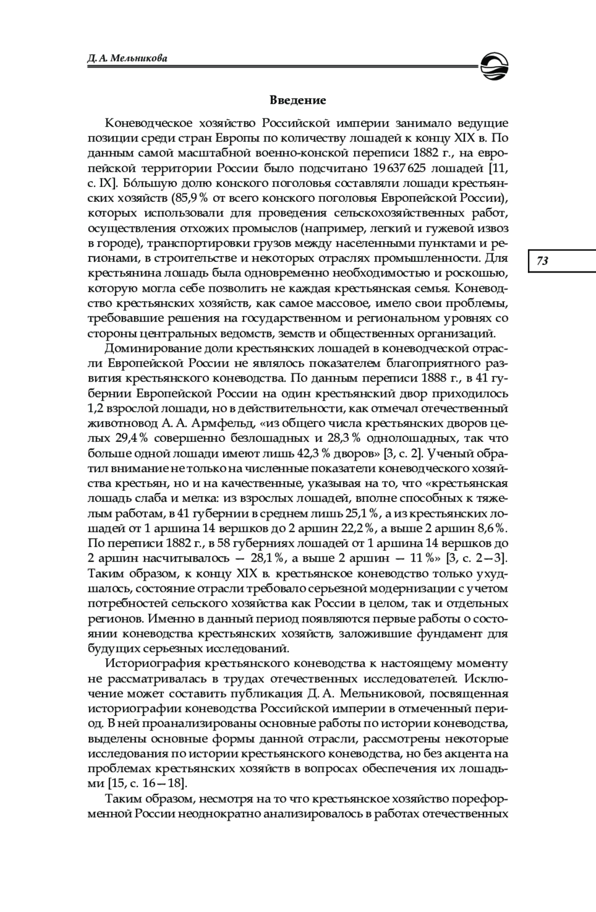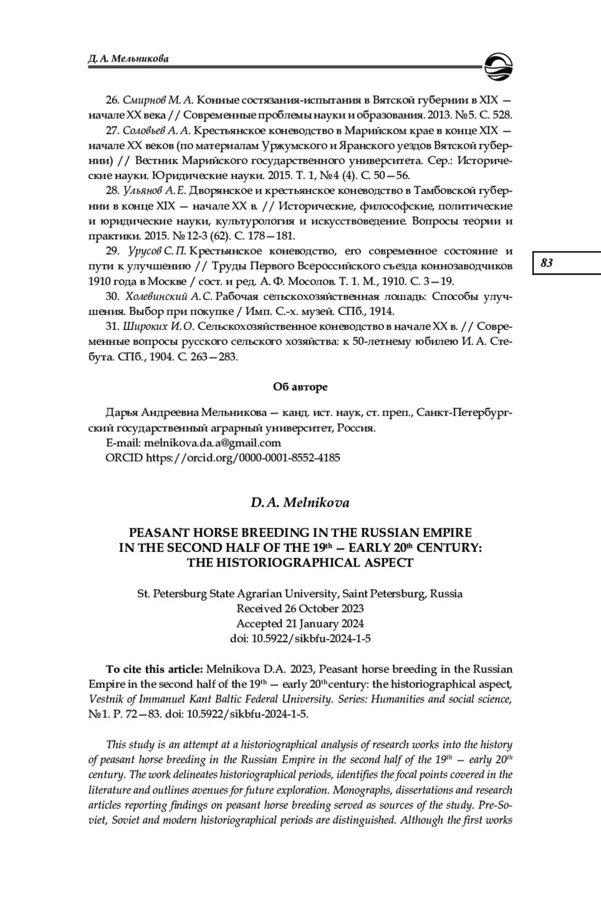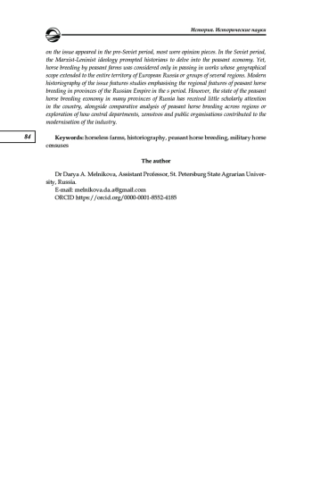 15. Мельникова Д. А. История коневодства Российской империи во второй половине XIX - начале XX века в отечественной историографии // Вестник Рязанского государственного университета им. С. А. Есенина. 2018. № 3 (60). С. 13-23. EDN: VAOTGM