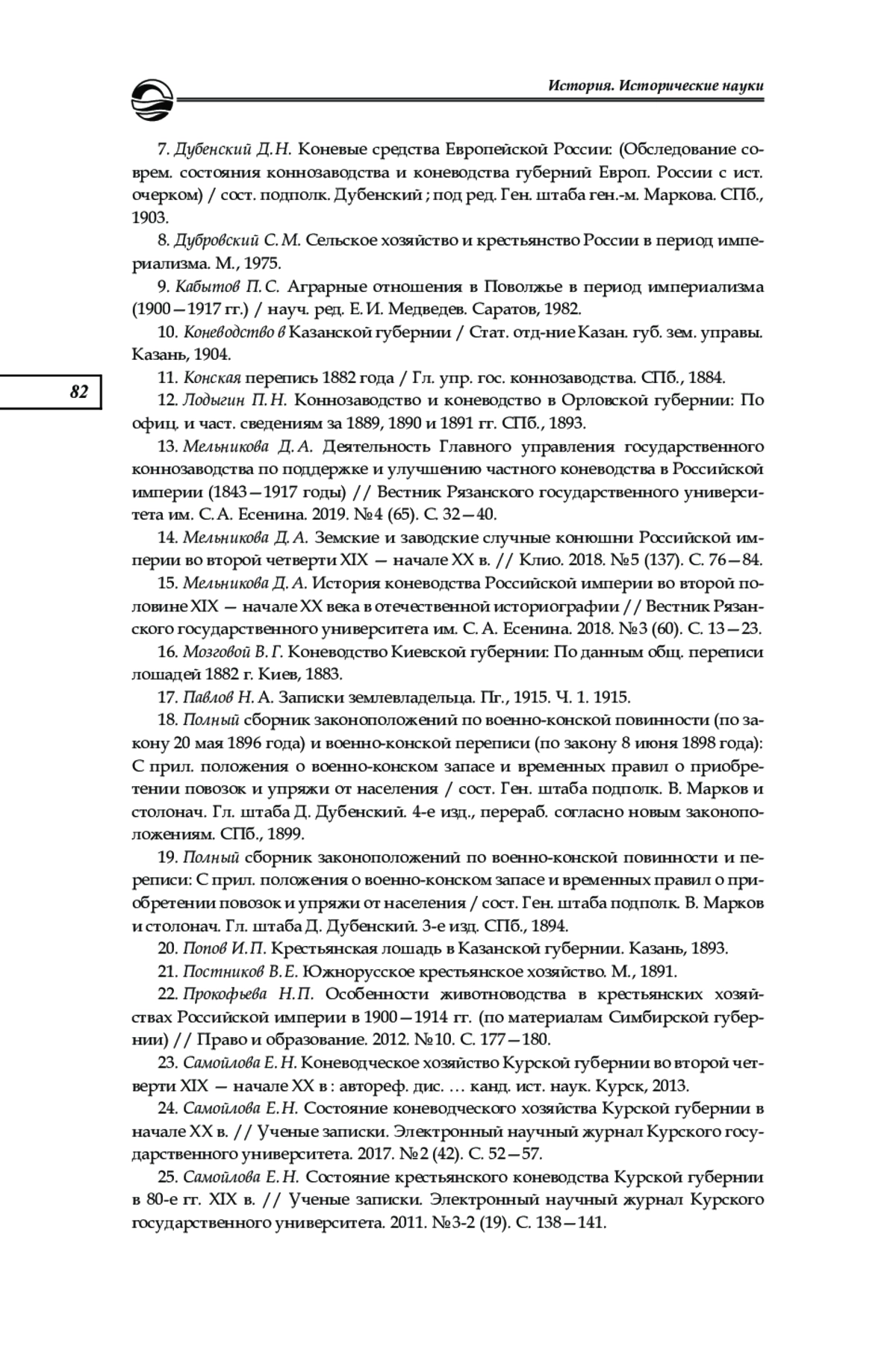 24. Самойлова Е. Н. Состояние коневодческого хозяйства Курской губернии в начале ХХ в. // Ученые записки. Электронный научный журнал Курского государственного университета. 2017. № 2 (42). С. 52-57. EDN: ZCPBYR