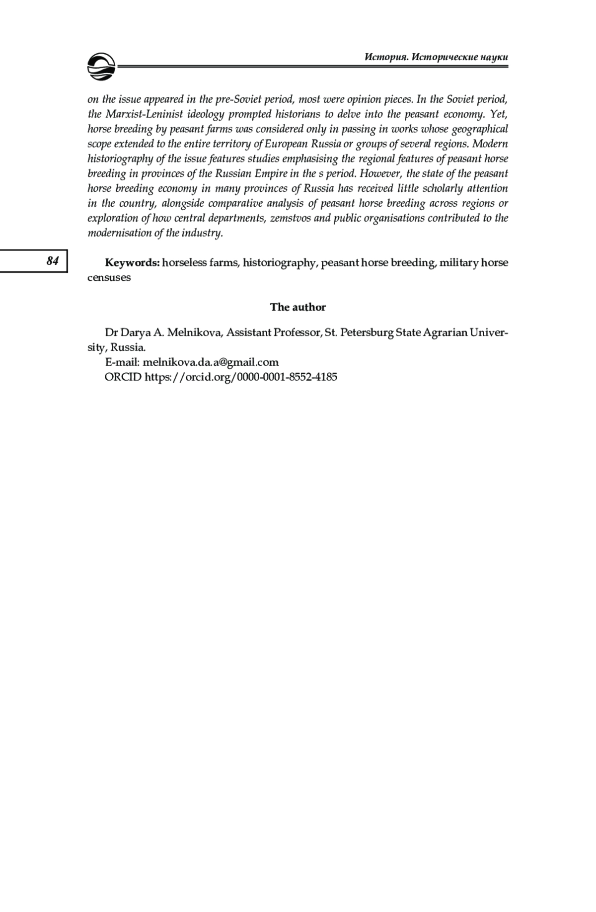 14. Мельникова Д. А. Земские и заводские случные конюшни Российской империи во второй четверти XIX - начале XX в. // Клио. 2018. № 5 (137). С. 76-84. EDN: XOTAAP