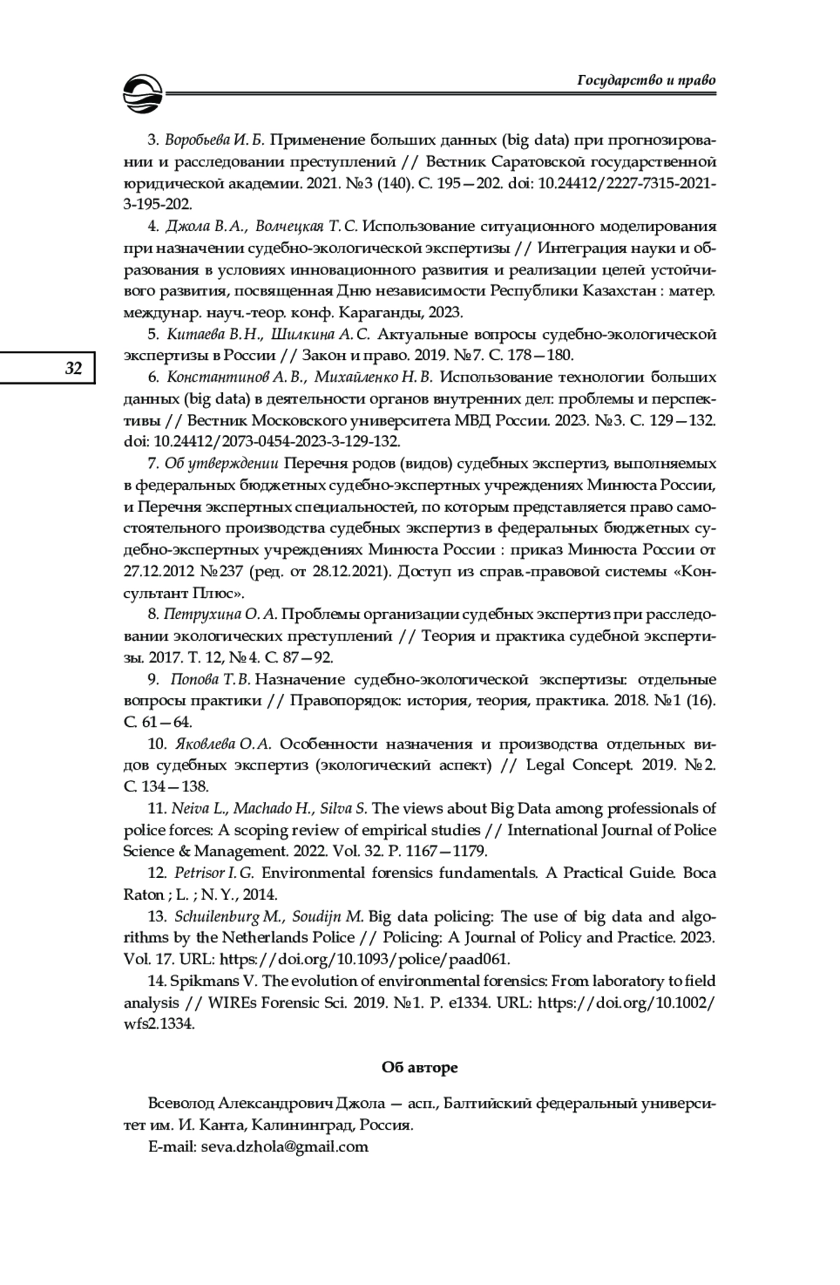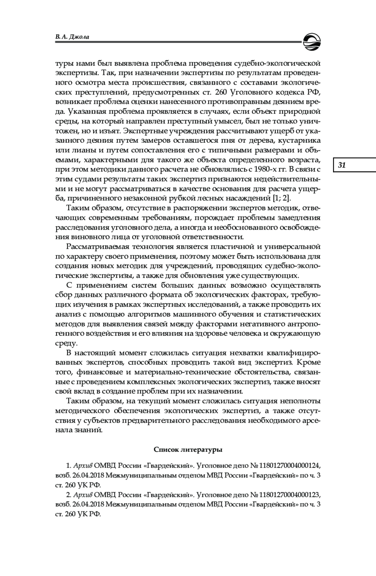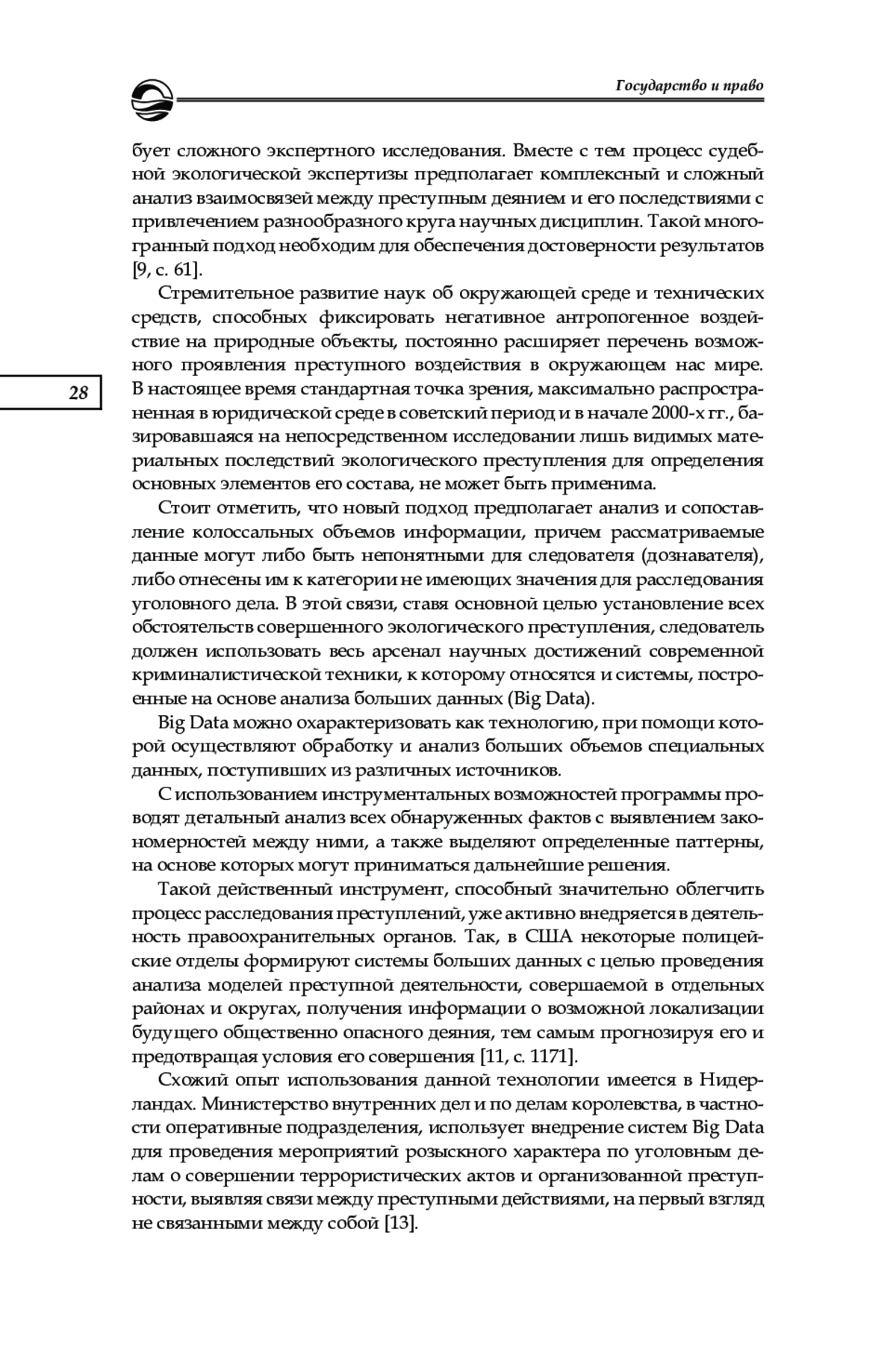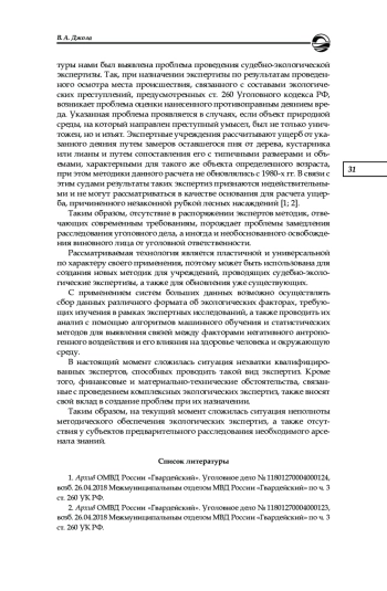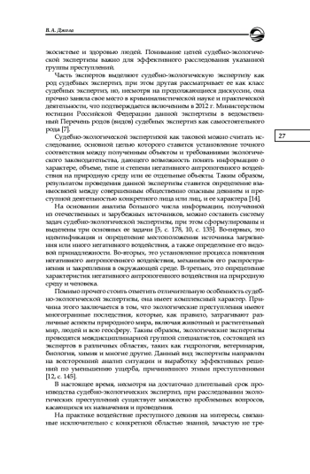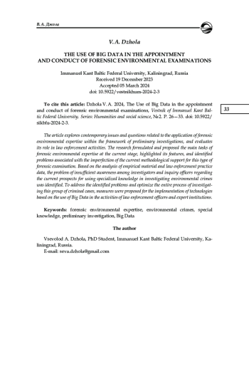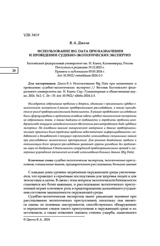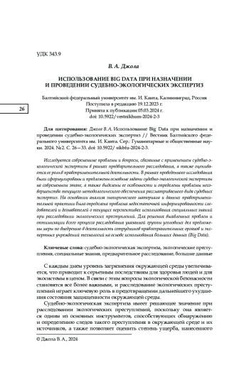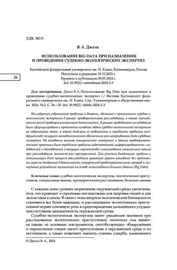 Исследуются современные проблемы и вопросы, связанные с применением судебно-экологической экспертизы в рамках предварительного расследования, а также оценивается ее роль в правоприменительной деятельности. В рамках проведенного исследования были сформулированы и предложены основные задачи судебно-экологической экспертизы на современном этапе, а также выделены ее особенности и определены проблемы несовершенства текущего методологического обеспечения рассматриваемого вида судебных экспертиз. На основании анализа эмпирического материала и данных правоприменительной практики была определена проблема недостаточной информированности следователей и дознавателей о текущих перспективах использования специальных знаний при расследовании экологических преступлений. Для решения выявленных проблем и оптимизации всего процесса расследования указанной группы уголовных дел предложены меры по внедрению в деятельность сотрудников правоохранительных органов и экспертных учреждений технологий на основе использования больших данных (Big Data).