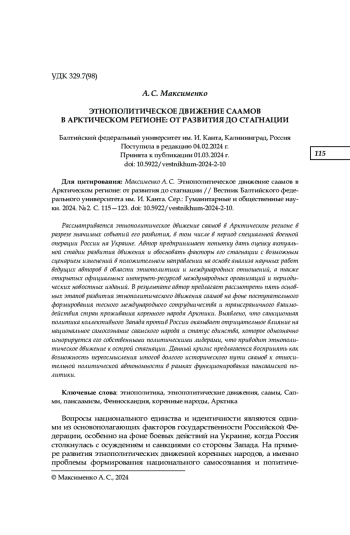 Рассматривается этнополитическое движение саамов в Арктическом регионе в разрезе значимых событий его развития, в том числе в период специальной военной операции России на Украине. Автор предпринимает попытку дать оценку актуальной стадии развития движения и обосновать факторы его стагнации с возможным сценарием изменений в положительном направлении на основе анализа научных работ ведущих авторов в области этнополитики и международных отношений, а также открытых официальных интернет-ресурсов международных организаций и периодических новостных изданий. В результате автор предлагает рассмотреть пять основных этапов развития этнополитического движения саамов на фоне поступательного формирования тесного международного сотрудничества и трансграничного взаимодействия стран проживания коренного народа Арктики. Выявлено, что санкционная политика коллективного Запада против России оказывает отрицательное влияние на национальное самосознание саамского народа и статус единства, которое однозначно игнорируется его собственными политическими лидерами, что приводит этнополитическое движение к острой стагнации. Данный кризис предлагается воспринять как возможность переосмысления итогов долгого исторического пути саамов к относительной политической автономности в рамках функционирования пансаамской политики