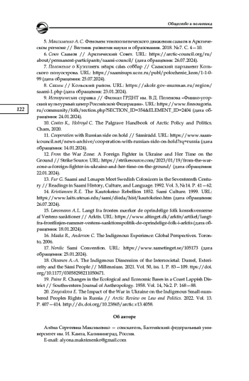20. Zmyvalova E. The Impact of the War in Ukraine on the Indigenous Small-numbered Peoples Rights in Russia // Arctic Review on Law and Politics. 2022. Vol. 13. Р. 407-414. EDN: QLGRAQ