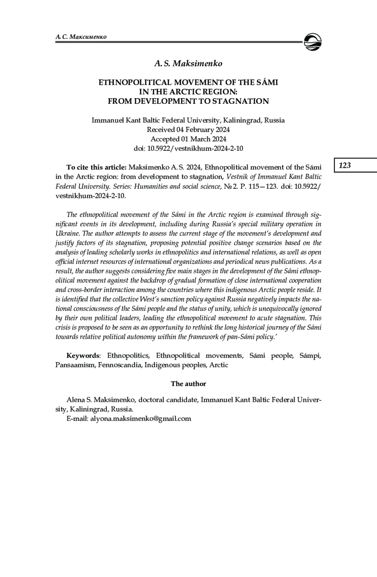 4. Корнеевец В. С., Максименко А. С. Роль Союза саамов в институализации пансаамизма // Власть. 2021. Т. 29, № 3. С. 138-141. EDN: WMAJRQ