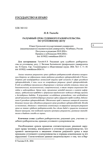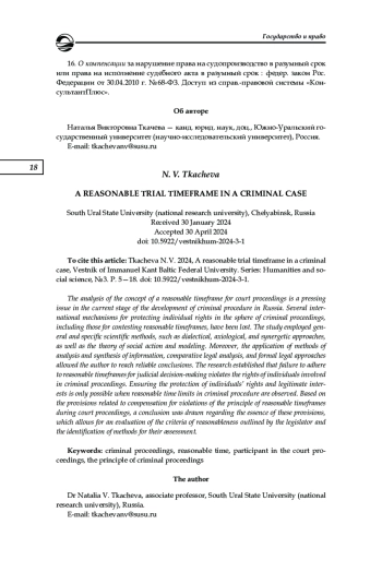 Анализ понятия разумности срока судебного разбирательства является актуальным вопросом на современном этапе развития уголовного судопроизводства в России. Утрачен ряд международных механизмов защиты прав личности в сфере уголовного судопроизводства, в том числе по оспариванию разумных сроков судопроизводства. В ходе исследования применялись общенаучные и частные методы познания, такие как диалектический, аксиологический, синергетический, а также теория социального действия и моделирование. Кроме того, применение методов анализа и синтеза информации, сравнительно-правового и формально-юридического позволило автору прийти к достоверным выводам. В результате исследования установлено, что несоблюдение сроков принятия соответствующих решений судом нарушает права человека, вовлекаемого в уголовное судопроизводство. Обеспечение прав и законных интересов личности возможно только при соблюдении разумного срока уголовного судопроизводства. Исходя из положений, связанных с понятиями компенсации за нарушение принципа разумного срока на этапах судебного разбирательства, был сделан вывод о сущности положений данного принципа, что позволяет оценить критерии разумности, указанные законодателем и выявить способы их оценки