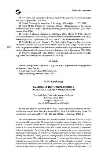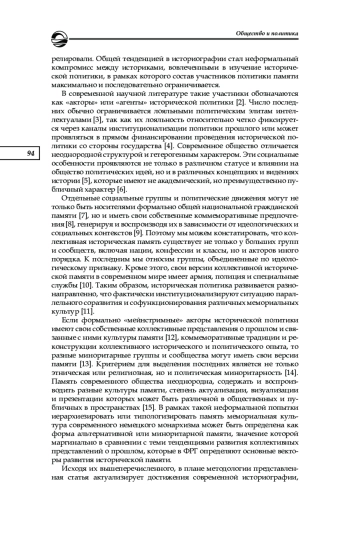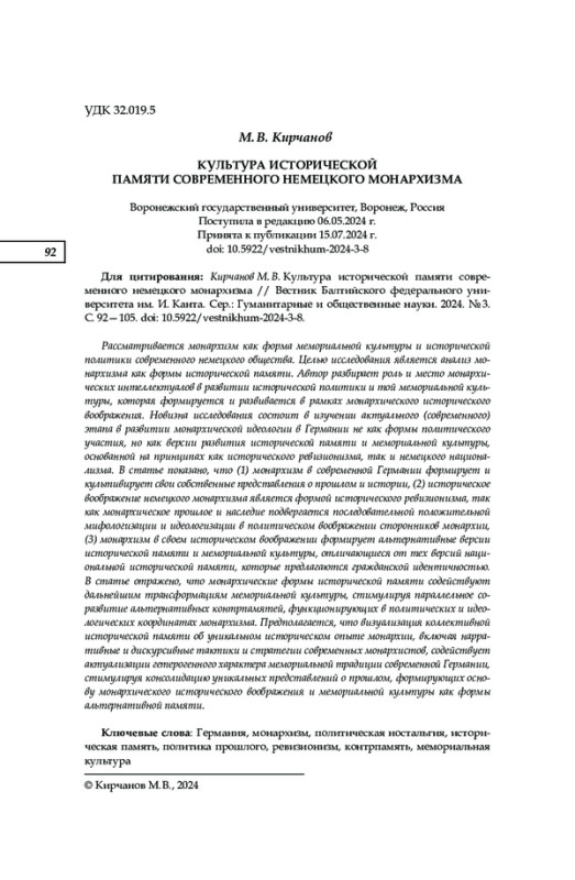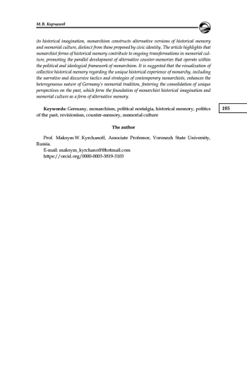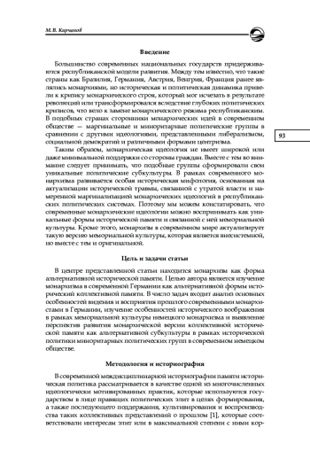 Рассматривается монархизм как форма мемориальной культуры и исторической политики современного немецкого общества. Целью исследования является анализ монархизма как формы исторической памяти. Автор разбирает роль и место монархических интеллектуалов в развитии исторической политики и той мемориальной культуры, которая формируется и развивается в рамках монархического исторического воображения. Новизна исследования состоит в изучении актуального (современного) этапа в развитии монархической идеологии в Германии не как формы политического участия, но как версии развития исторической памяти и мемориальной культуры, основанной на принципах как исторического ревизионизма, так и немецкого национализма. В статье показано, что (1) монархизм в современной Германии формирует и культивирует свои собственные представления о прошлом и истории, (2) историческое воображение немецкого монархизма является формой исторического ревизионизма, так как монархическое прошлое и наследие подвергается последовательной положительной мифологизации и идеологизации в политическом воображении сторонников монархии, (3) монархизм в своем историческом воображении формирует альтернативные версии исторической памяти и мемориальной культуры, отличающиеся от тех версий национальной исторической памяти, которые предлагаются гражданской идентичностью. В статье отражено, что монархические формы исторической памяти содействуют дальнейшим трансформациям мемориальной культуры, стимулируя параллельное соразвитие альтернативных контрпамятей, функционирующих в политических и идеологических координатах монархизма. Предполагается, что визуализация коллективной исторической памяти об уникальном историческом опыте монархии, включая нарративные и дискурсивные тактики и стратегии современных монархистов, содействует актуализации гетерогенного характера мемориальной традиции современной Германии, стимулируя консолидацию уникальных представлений о прошлом, формирующих основу монархического исторического воображения и мемориальной культуры как формы альтернативной памяти