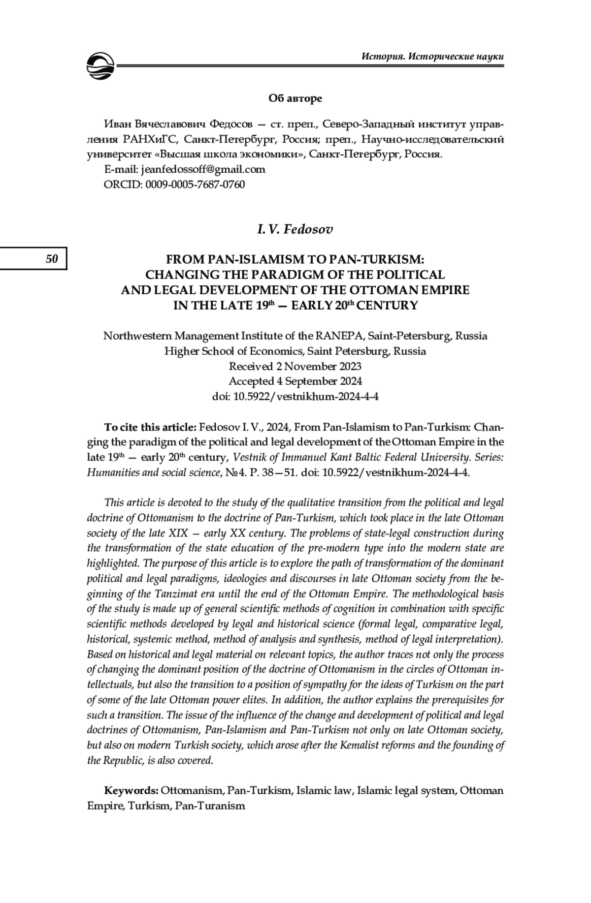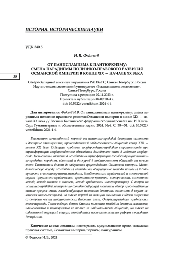 Рассмотрен качественный переход от политико-правовой доктрины османизма к доктрине пантюркизма, происходивший в позднеосманском обществе конца XIX — начала XX века. Освещены проблемы государственно-правового строительства при трансформации государственного образования домодерного типа в модерное государство. Цель статьи состоит в исследовании трансформации господствующих политико-правовых парадигм, идеологий и дискурсов в позднеосманском обществе от начала эпохи Танзимата и вплоть до завершения существования Османской империи. Методологическую основу исследования составляют общенаучные методы познания в совокупности с частнонаучными методами, выработанными юридической и исторической наукой (формально-юридический, сравнительно-правовой, исторический, системный метод, метод анализа и синтеза, метод юридической интерпретации). С опорой на историко-правовой материал по соответствующей тематике автор прослеживает не только процесс смены господствующего положения доктрины османизма в кругах османских интеллектуалов, но также переход на позиции симпатий к идеям тюркизма со стороны части позднеосманских властных элит. Охарактеризованы предпосылки этого перехода. Также освещен вопрос влияния политико-правовых доктрин османизма, панисламизма и пантюркизма не только на позднеосманское общество, но также на современный турецкий социум, зародившийся после кемалистских реформ и основания Республики