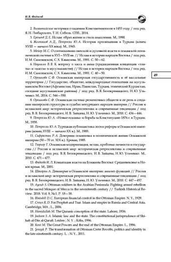 5. Мейер М. С. О соотношении светской и духовной власти в османской политической системе в XVI-XVII вв. // Ислам в истории народов Востока / под ред. И. М. Смилянской, С. Х. Кямилева. М., 1981. С. 50-62.