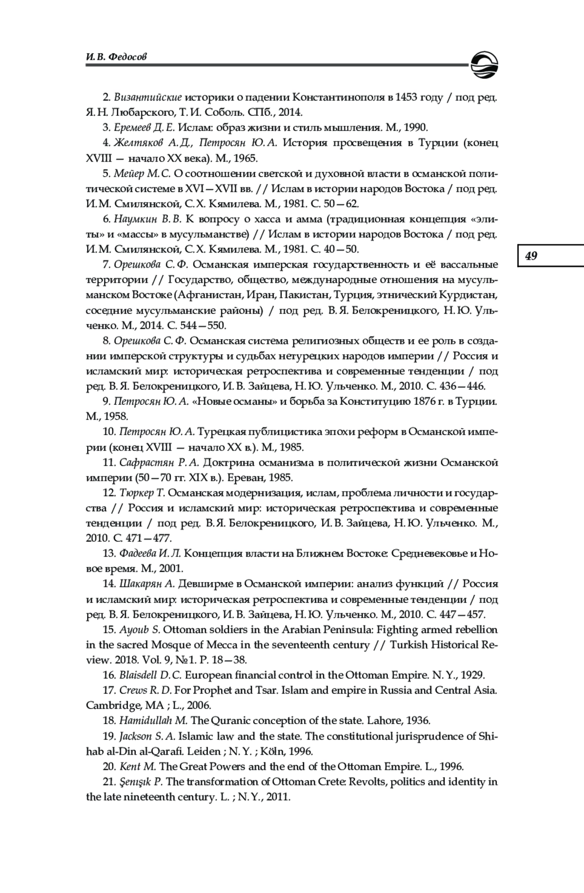 12. Тюркер Т. Османская модернизация, ислам, проблема личности и государства // Россия и исламский мир: историческая ретроспектива и современные тенденции / под ред. В. Я. Белокреницкого, И. В. Зайцева, Н. Ю. Ульченко. М., 2010. С. 471-477.