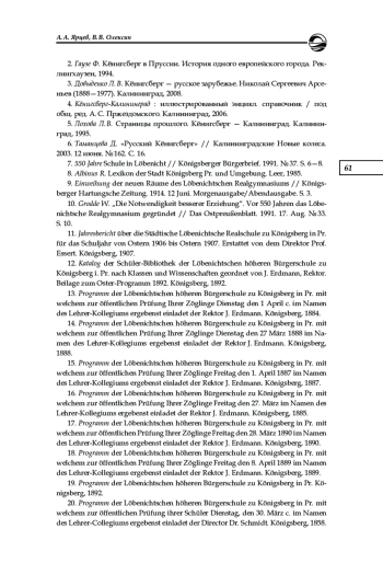 6. Таманцева Д. “Русский Кёнигсберг” // Калининградские Новые колеса. 2003. 12 июня. № 162. С. 16.