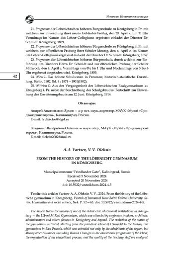 Прослежена история одного из старейших элитных учебных заведений Кёнигсберга — Лёбенихтской реальной гимназии, в которой учились известные в дальнейшем в городе и за его пределами инженеры, банкиры, архитекторы, администраторы. Рассмотрена эволюция статуса гимназии от церковно-приходской школы города Лёбенихта до ведущей реальной гимназии в Восточной Пруссии, в которой получали образование не только местные жители, но и выходцы из других стран, в том числе России. Проанализированы изменения в образовательной программе учебного заведения, организация учебного процесса, качество преподавательского состава. Статья может представлять интерес для исследователей истории Кёнигсберга-Калининграда, истории педагогической науки, в том числе традиций немецкой педагогики