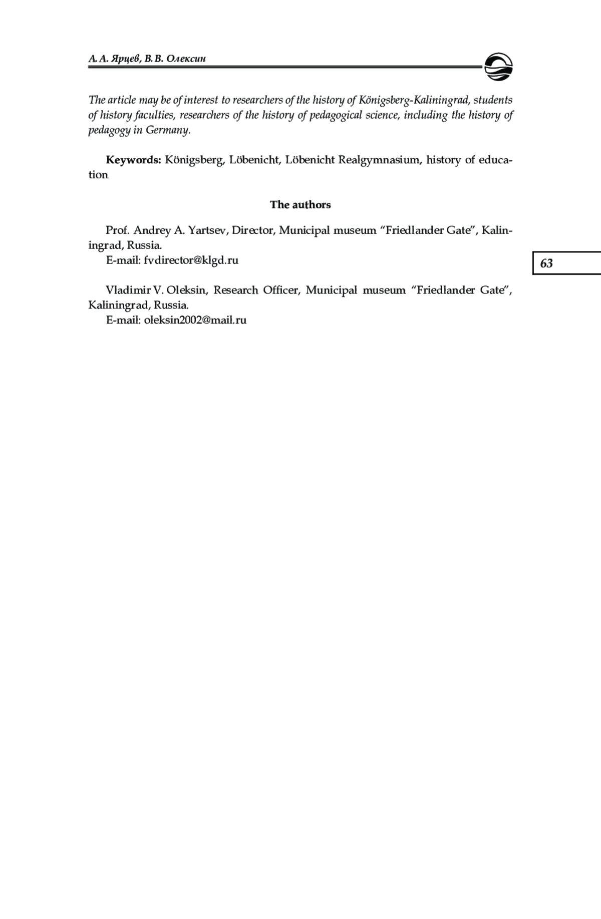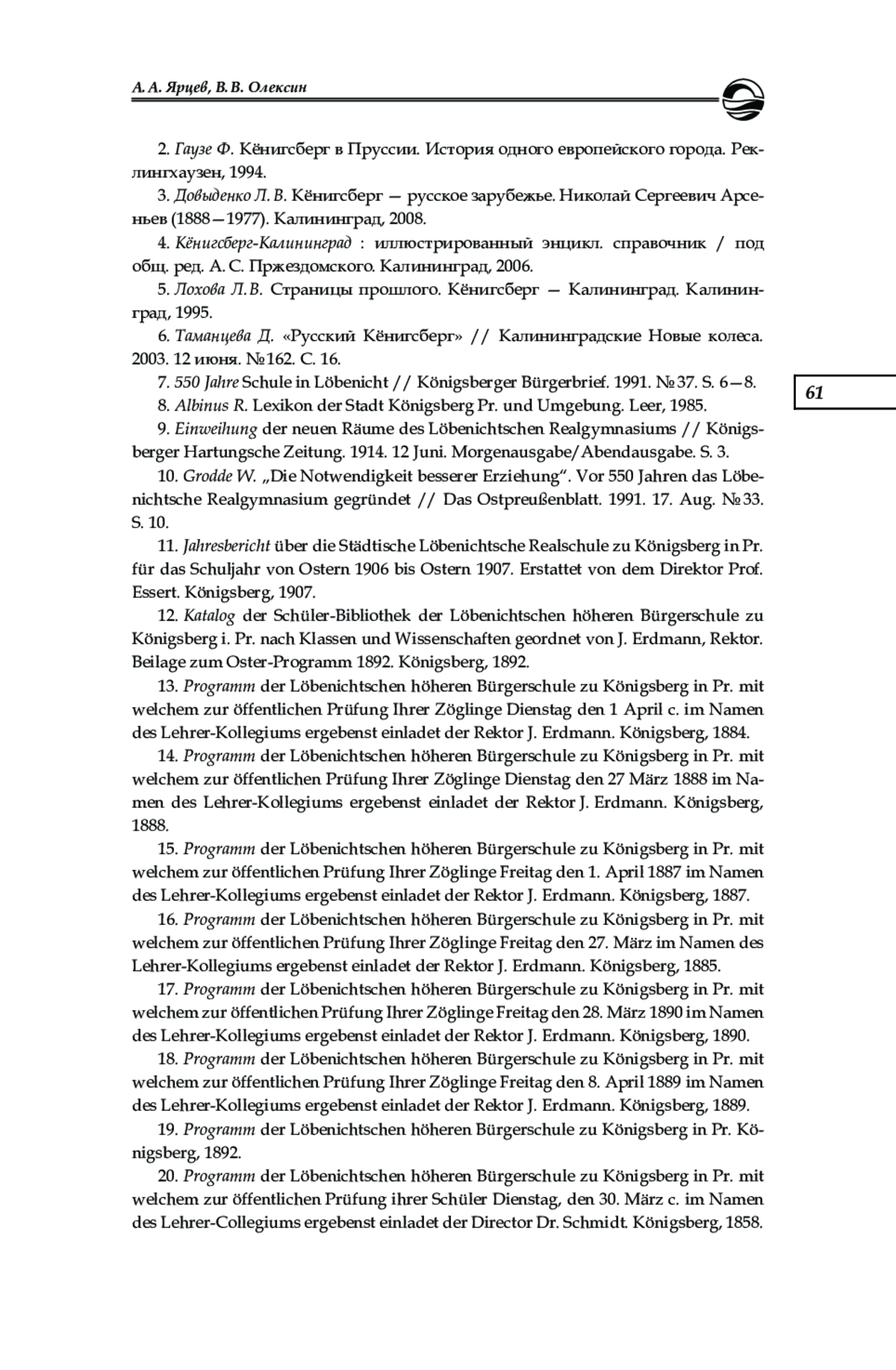 10. Grodde W..,Die Notwendigkeit besserer Erziehung“. Vor 550 Jahren das Löbenichtsche Realgymnasium gegründet // Das Ostpreußenblatt. 1991. 17. Aug. № 33. S. 10.