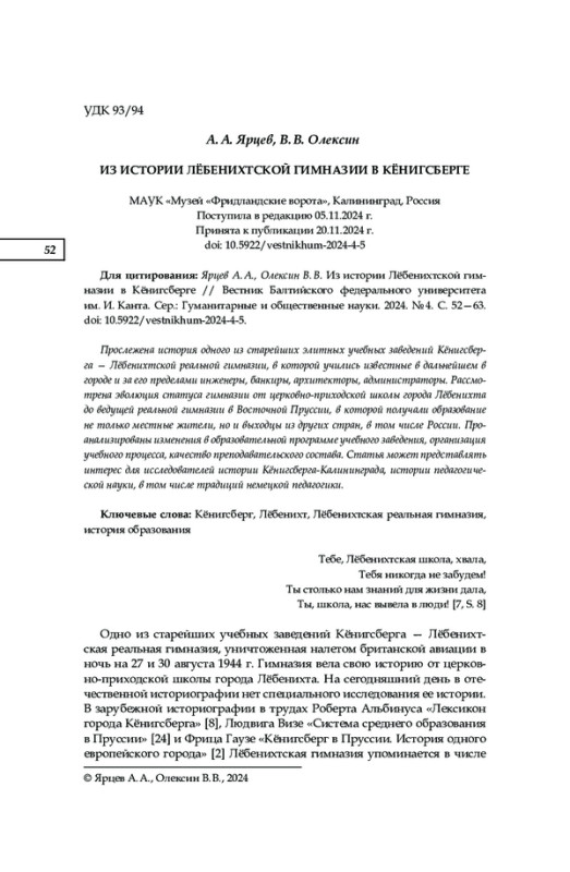 Одно из старейших учебных заведений Кёнигсберга — Лёбенихтская реальная гимназия, уничтоженная налетом британской авиации в ночь на 27 и 30 августа 1944 г. Гимназия вела свою историю от церковно-приходской школы города Лёбенихта. На сегодняшний день в отечественной историографии нет специального исследования ее истории. В зарубежной историографии в трудах Роберта Альбинуса «Лексикон города Кёнигсберга» [8], Людвига Визе «Система среднего образования в Пруссии» [24] и Фрица Гаузе «Кёнигсберг в Пруссии.