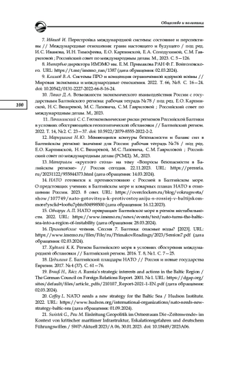 12. Маркушина Н. Ю. Меняющиеся контуры безопасности и баланс сил в Балтийском регионе: значение для России: рабочая тетрадь № 76 / под ред. Е. О. Карпинской, Н. С. Вяхиревой, М. С. Лазовича, С. М. Гавриловой; Российский совет по международным делам (РСМД). М., 2023.