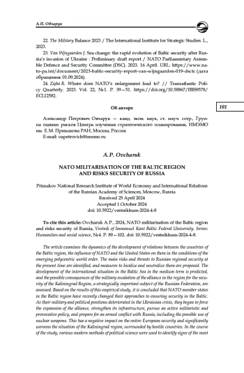 23. Van Wjngaarden J. Sea change: the rapid evolution of Baltic security after Russia’s invasion of Ukraine: Preliminary draft report / NATO Parliamentary Assemble Defence and Security Committee (DSC). 2023. 16 April. URL: https://www.nato-pa.int/document/2023-baltic-security-report-van-wijngaarden-019-dsctc (дата обращения: 01.09.2024).