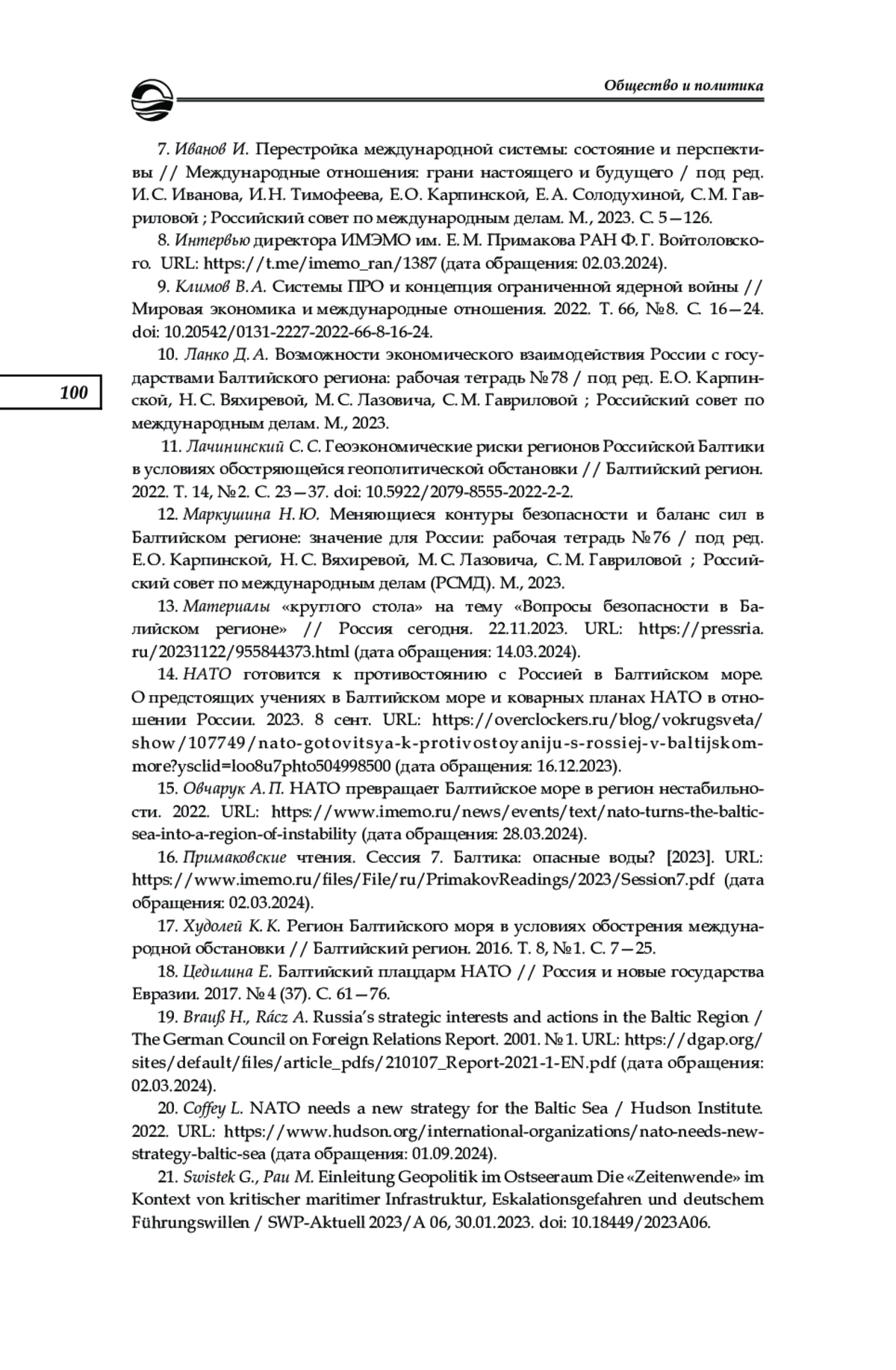 16. Примаковские чтения. Сессия 7. Балтика: опасные воды? [2023]. URL: https://www.imemo.ru/files/File/ru/PrimakovReadings/2023/Session7.pdf (дата обращения: 02.03.2024).
