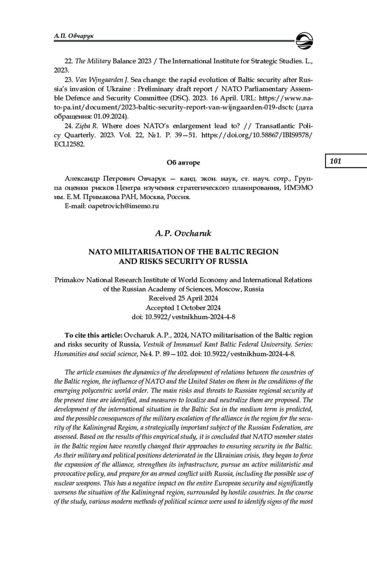 24. Zięba R. Where does NATO’s enlargement lead to? // Transatlantic Policy Quarterly. 2023. Vol. 22, № 1. Р. 39-51. DOI: 10.58867/IBIS9578/ECLI2582 EDN: HVIIWZ