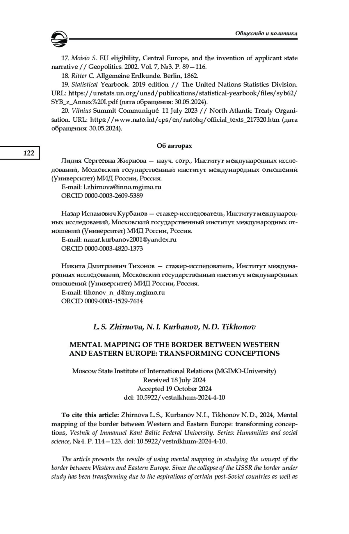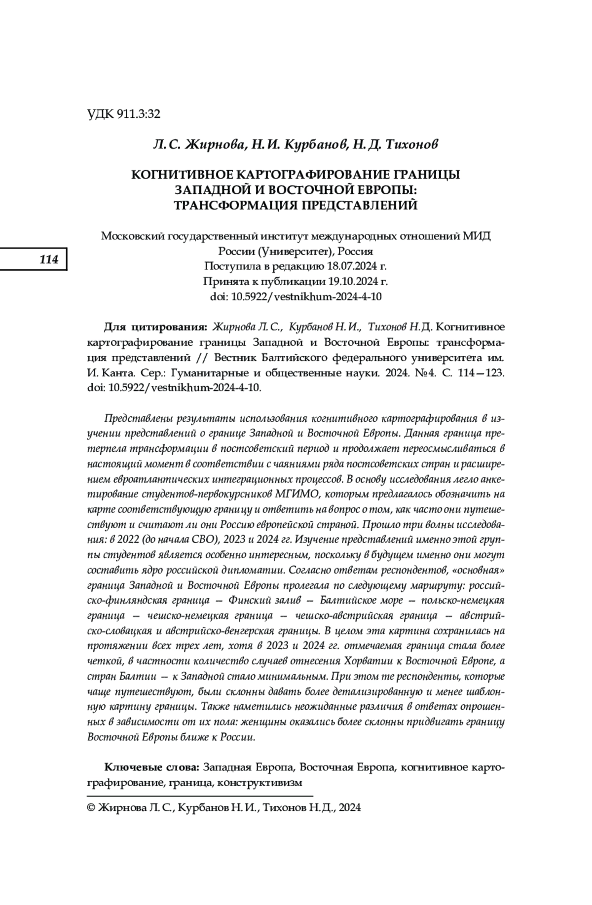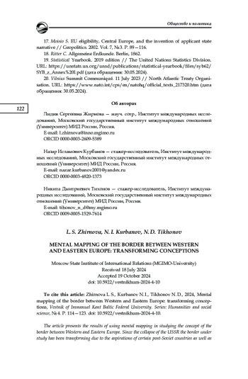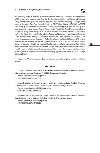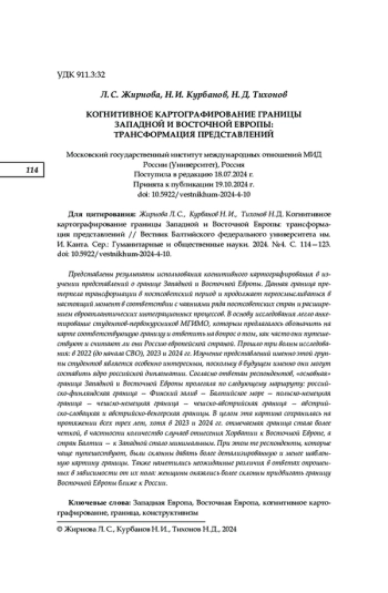 Представлены результаты использования когнитивного картографирования в изучении представлений о границе Западной и Восточной Европы. Данная граница претерпела трансформации в постсоветский период и продолжает переосмысливаться в настоящий момент в соответствии с чаяниями ряда постсоветских стран и расширением евроатлантических интеграционных процессов. В основу исследования легло анкетирование студентов-первокурсников МГИМО, которым предлагалось обозначить на карте соответствующую границу и ответить на вопрос о том, как часто они путешествуют и считают ли они Россию европейской страной. Прошло три волны исследования: в 2022 (до начала СВО), 2023 и 2024 гг. Изучение представлений именно этой группы студентов является особенно интересным, поскольку в будущем именно они могут составить ядро российской дипломатии. Согласно ответам респондентов, «основная» граница Западной и Восточной Европы пролегала по следующему маршруту: российско-финляндская граница — Финский залив — Балтийское море — польско-немецкая граница — чешско-немецкая граница — чешско-австрийская граница — австрийско-словацкая и австрийско-венгерская границы. В целом эта картина сохранилась на протяжении всех трех лет, хотя в 2023 и 2024 гг. отмечаемая граница стала более четкой, в частности количество случаев отнесения Хорватии к Восточной Европе, а стран Балтии — к Западной стало минимальным. При этом те респонденты, которые чаще путешествуют, были склонны давать более детализированную и менее шаблонную картину границы. Также наметились неожиданные различия в ответах опрошенных в зависимости от их пола: женщины оказались более склонны придвигать границу Восточной Европы ближе к России