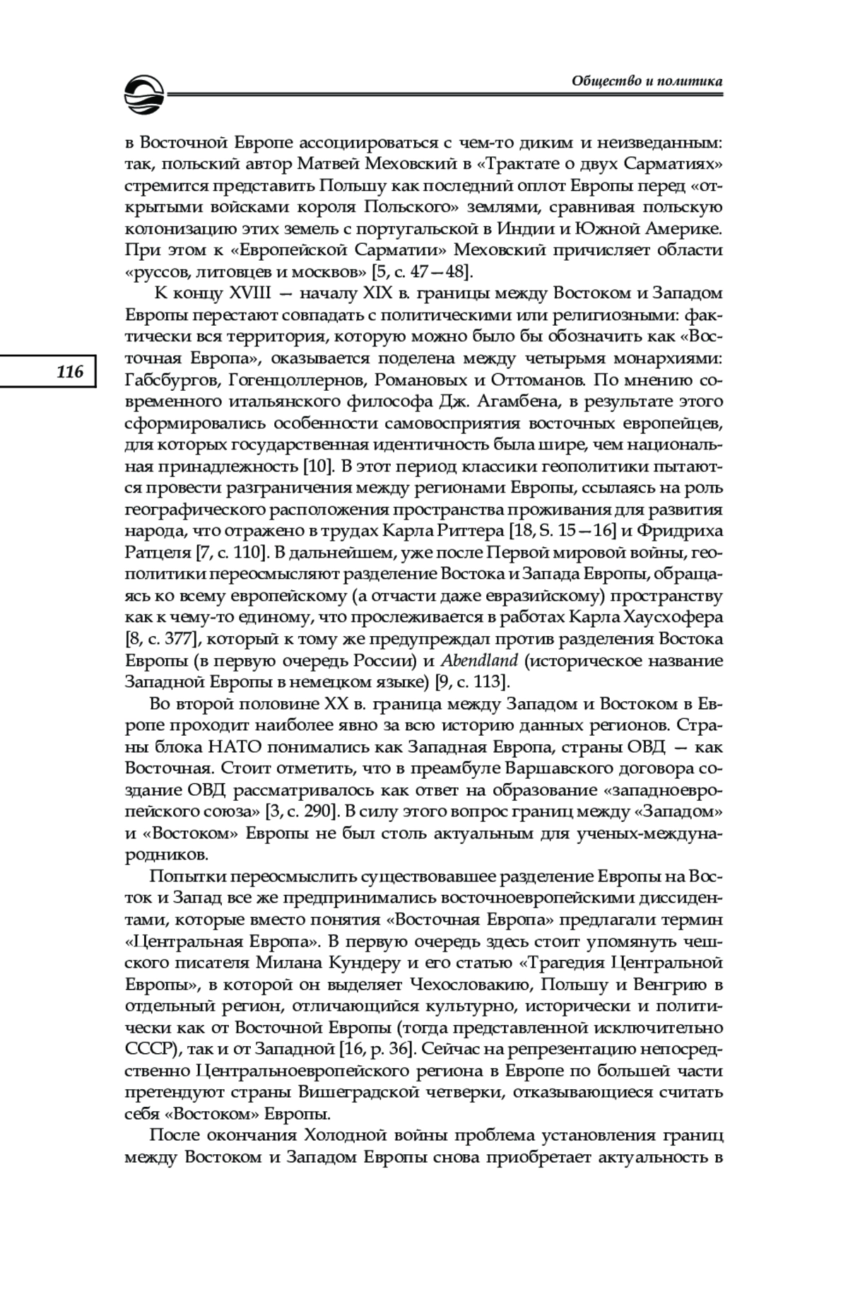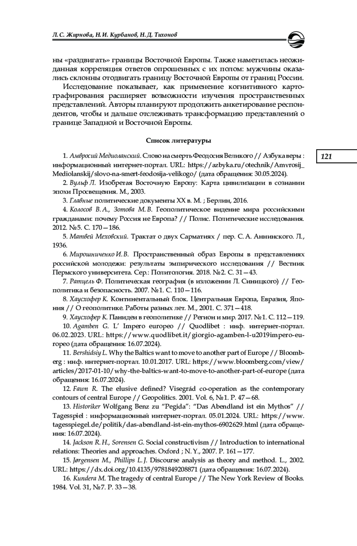 6. Мирошниченко И. В. Пространственный образ Европы в представлениях российской молодежи: результаты эмпирического исследования // Вестник Пермского университета. Сер.: Политология. 2018. № 2. С. 31-43.