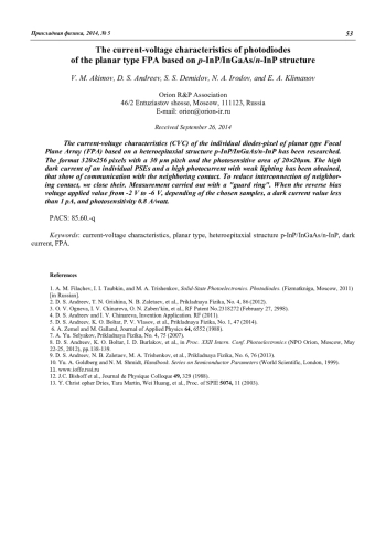 V. M. Akimov, D. S. Andreev, S. S. Demidov, N. A. Irodov, and E. A. Klimanov The current-voltage characteristics of photodiodes of the planar type FPA based on p-InP/InGaAs/n-InP structure 50