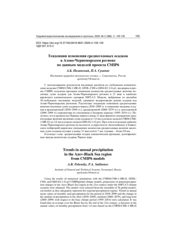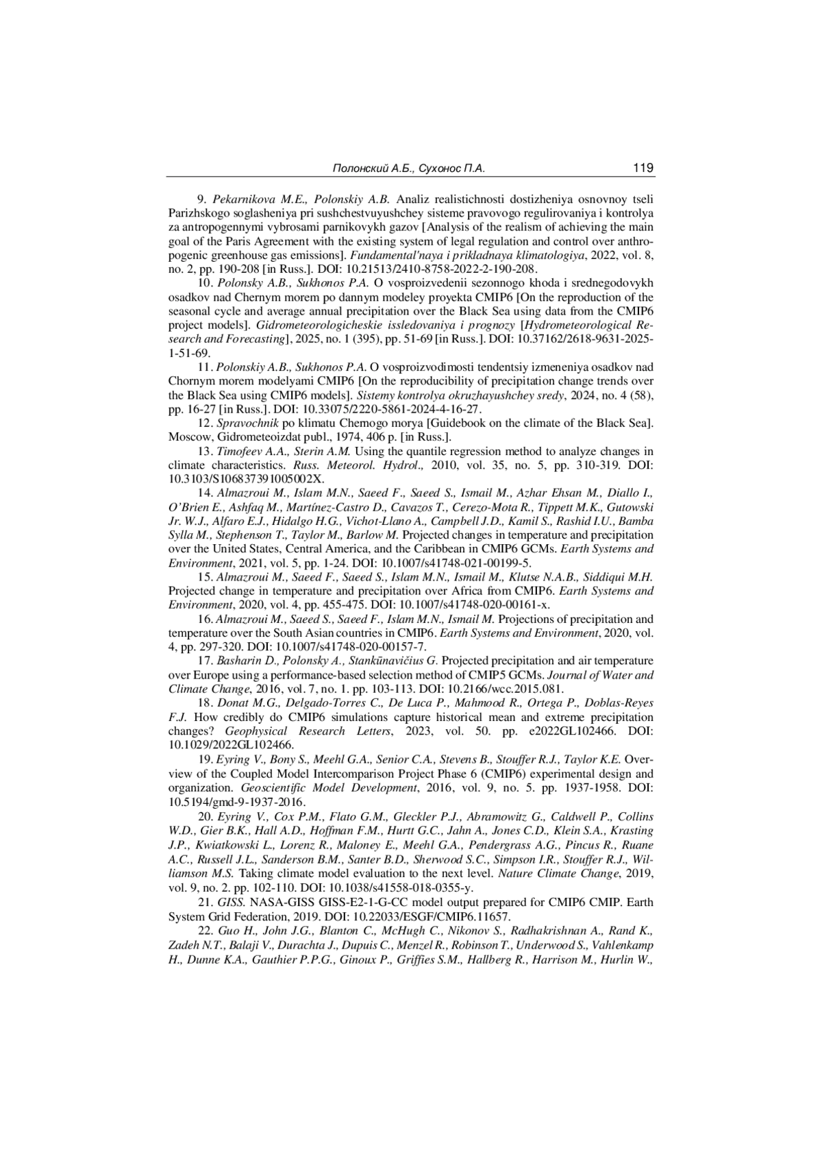 11. Полонский А.Б., Сухонос П.А. О воспроизведении сезонного хода и среднегодовых осадков над Черным морем по данным моделей проекта CMIP6 // Гидрометеорологические исследования и прогнозы. 2025. № 1 (395). С. 51-69. DOI: 10.37162/2618-9631-2025-1-51-69 EDN: JSKWPD