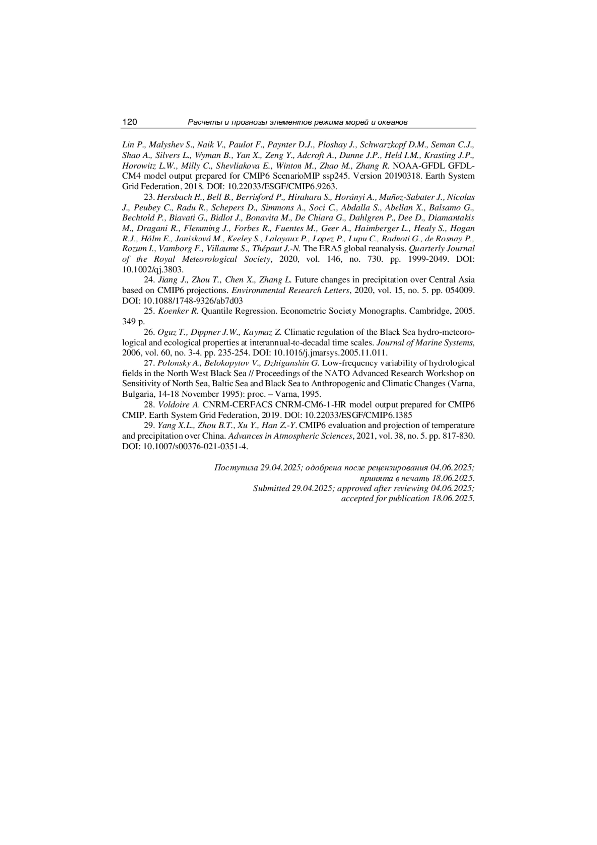 10. Полонский А.Б., Сухонос П.А. О воспроизводимости тенденций изменения осадков над Черным морем моделями CMIP6 // Системы контроля окружающей среды. 2024. № 4 (58). С. 16-27. DOI: 10.33075/2220-5861-2024-4-16-27 EDN: CEPYNO