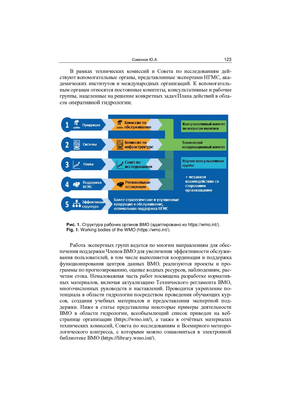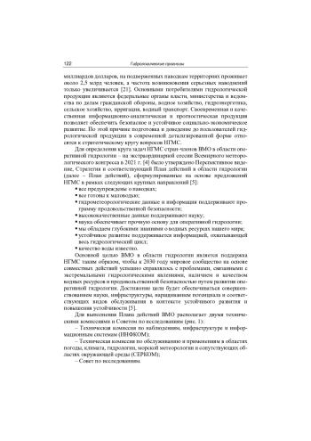 Работа экспертных групп ведется по многим направлениям для обеспечения поддержки Членов ВМО для увеличения эффективности обслуживания пользователей, в том числе выполняется координация и поддержка функционирования центров данных ВМО, реализуются проекты и программы по прогнозированию, оценке водных ресурсов, наблюдениям, расчетам стока. Немаловажная часть работ посвящена разработке нормативных материалов, включая актуализацию Технического регламента ВМО, многочисленных руководств и наставлений. Проводится укрепление потенциала в области гидрологии посредством проведения обучающих курсов, создания учебных материалов и предоставления экспертной поддержки. Ниже в статье представлены некоторые примеры деятельности ВМО в области гидрологии, всеобъемлющий список приведен на вебстранице организации (https://wmo. int/), а также в отчётных материалах технических комиссий, Совета по исследованиям и Всемирного метеорологического конгресса, с которыми можно ознакомиться в электронной библиотеке ВМО (https://library. wmo. int/).