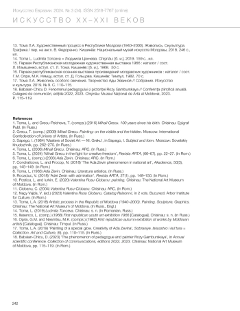 13. Toma, L. A. *Artistic Process in the Republic of Moldova (1940–2000): Painting. Sculpture. Graphics*. Chisinau: The National Art Museum of Moldova, 2018. (In Russ., Engl.)