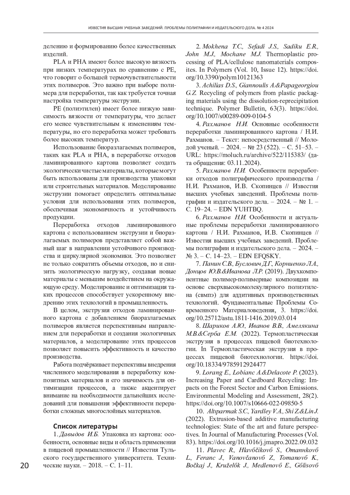 6. Рахманов Н.И. Особенности и актуальные проблемы переработки ламинированного картона / Н.И. Рахманов, И.В. Скопинцев // Известия высших учебных заведений. Проблемы полиграфии и издательского дела. - 2024. - № 3. - С. 14-23. EDN: EFQSKY