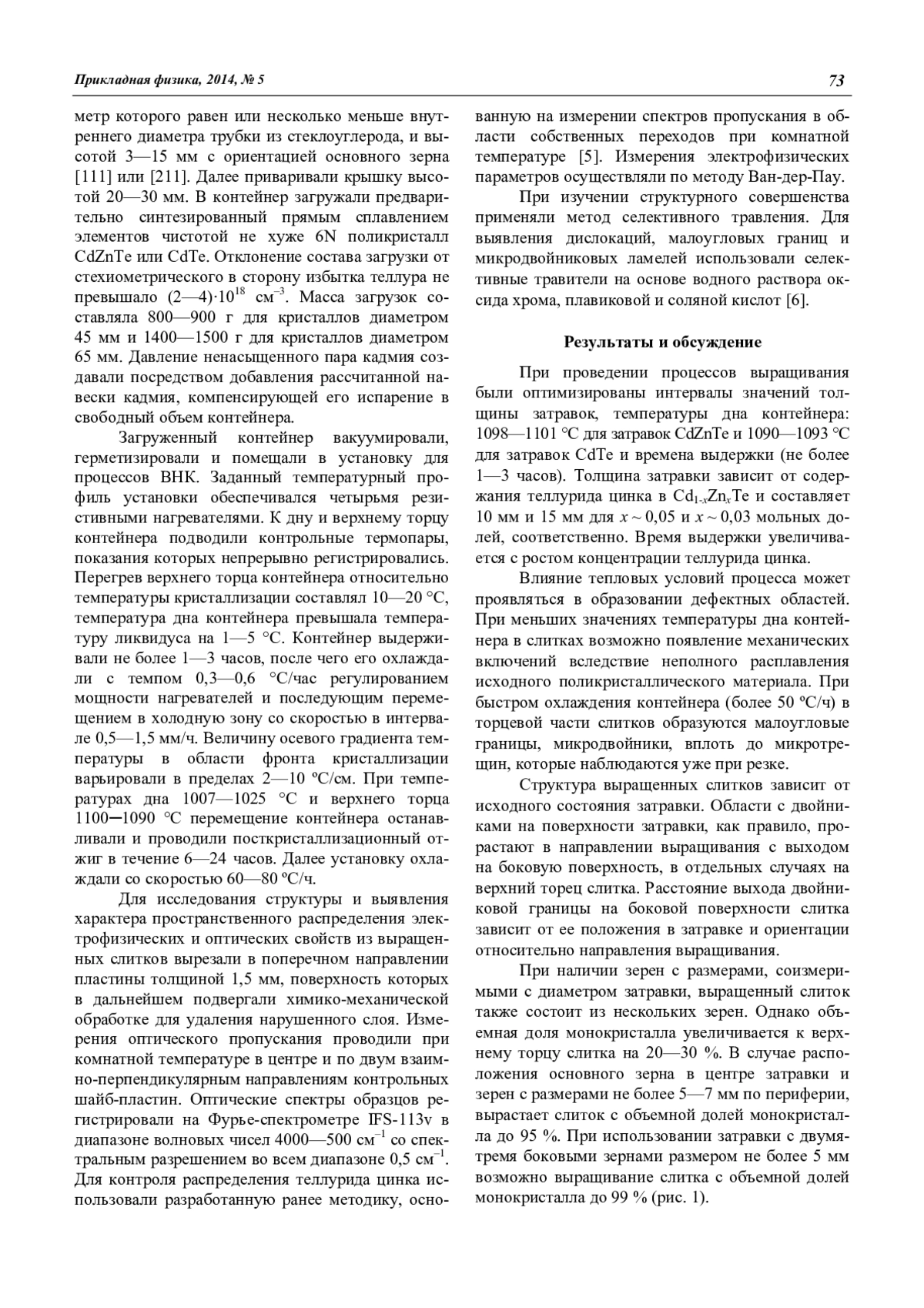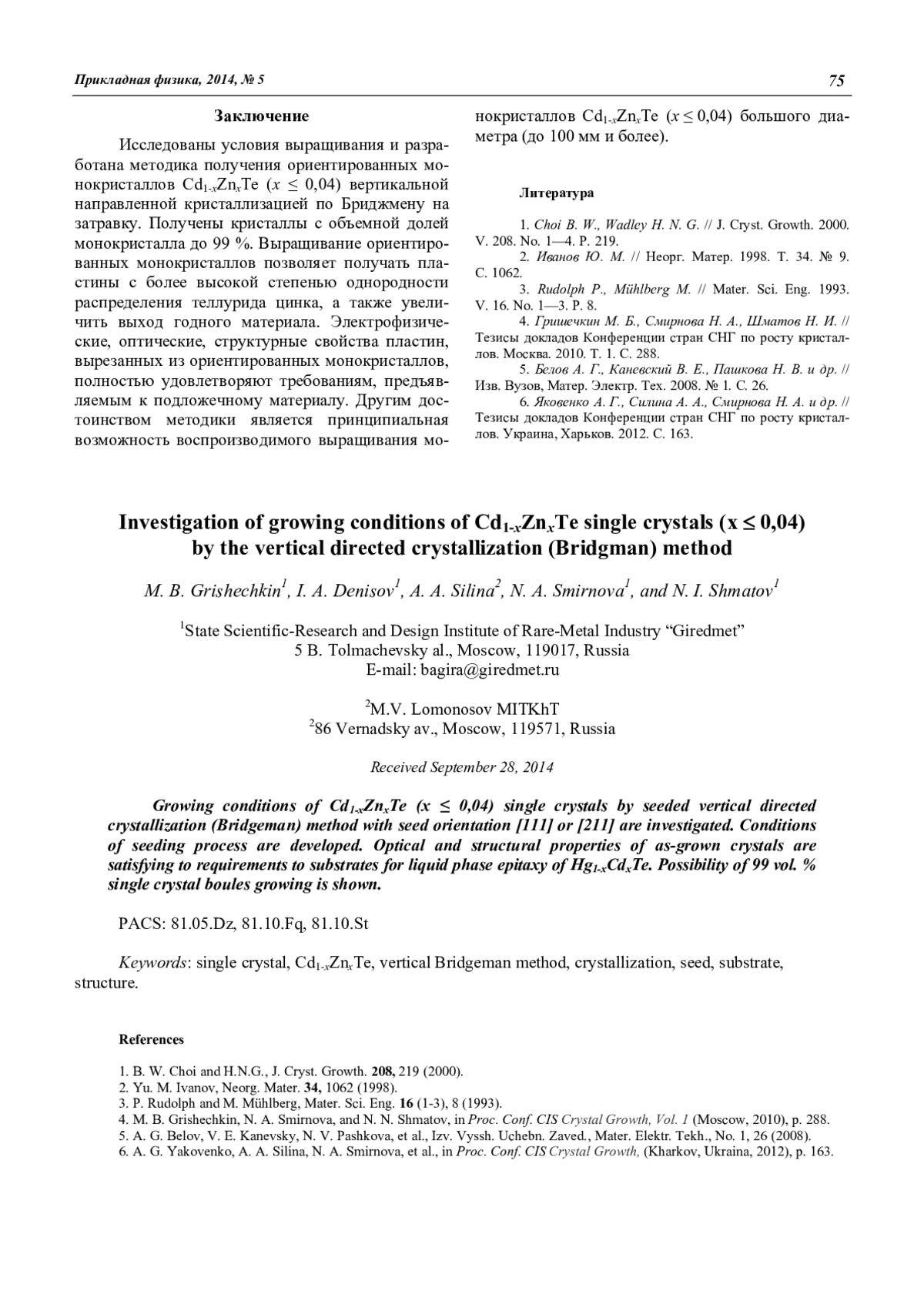 M. B. Grishechkin, I. A. Denisov, A. A. Silina, N. A. Smirnova, and N. I. Shmatov Investigation of growing conditions of Cd1-xZnxTe single crystals (x 0,04) by the vertical directed сrystallization (Bridgman) method 72
