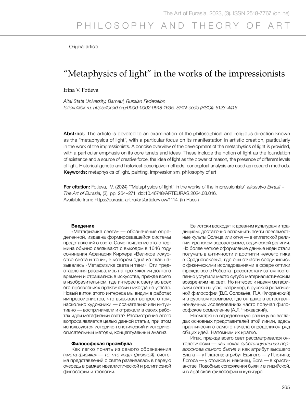Фотиева И.В. «Метафизика света» в работах импрессионистов // Искусство Евразии [Электронный журнал]. 2024. No 3 (34). С. 264–271. https://doi.org/10.46748/ARTEURAS.2024.03.016. URL: https://eurasia-art.ru/art/article/view/1114.