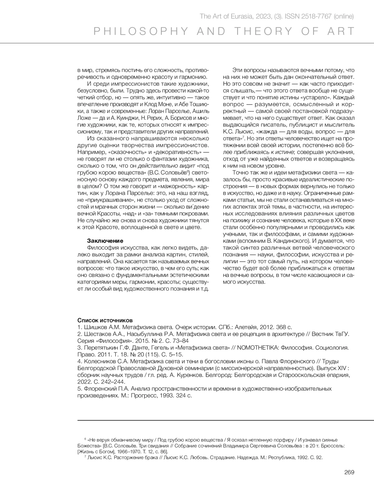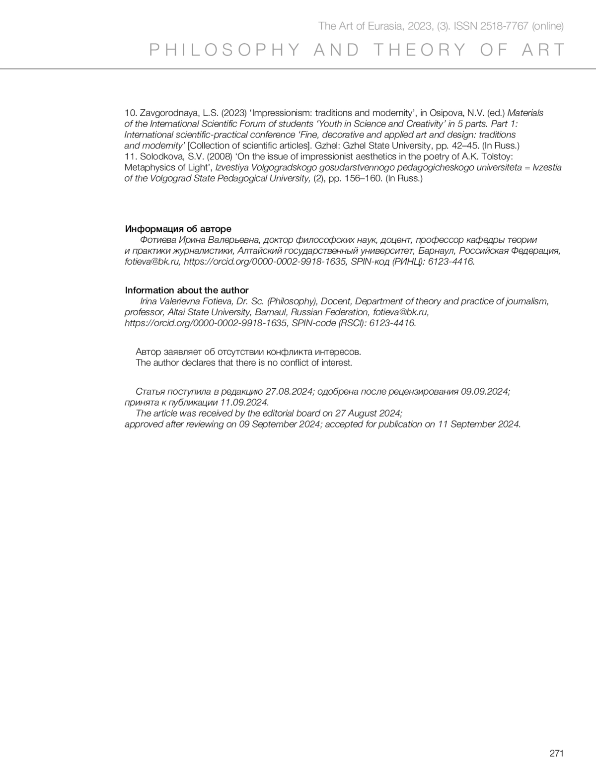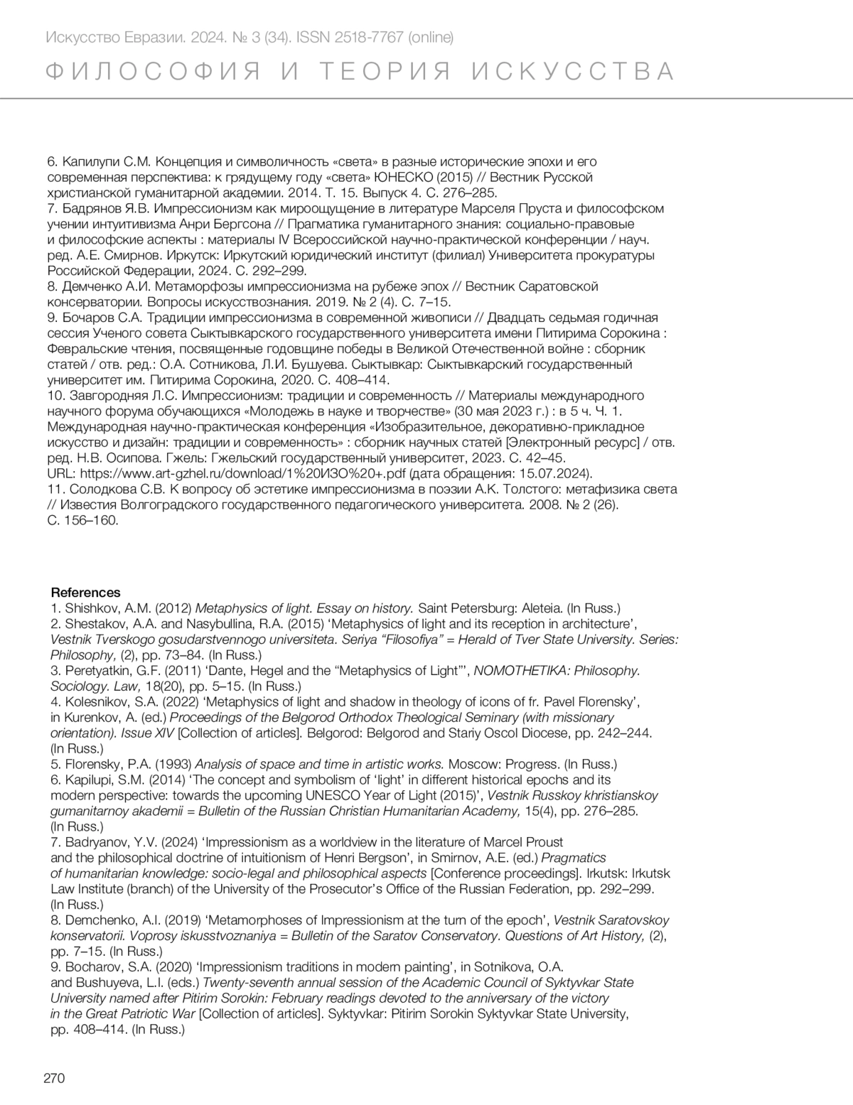 8. Demchenko, A. I. ‘Metamorphoses of Impressionism at the Turn of the Epoch’. *Vestnik Saratovskoy konservatorii. Voprosy iskusstvoznaniya = Bulletin of the Saratov Conservatory. Questions of Art History*, (2), 2019, pp. 7–15. (In Russ.)