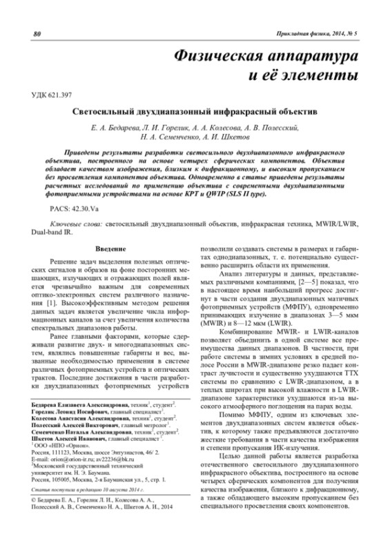 Бедарева Е. А., Горелик Л. И., Колесова А. А., Полесский А. В., Семенченко Н. А., Шкетов А. И. Светосильный двухдиа-пазонный инфракрасный объектив 80