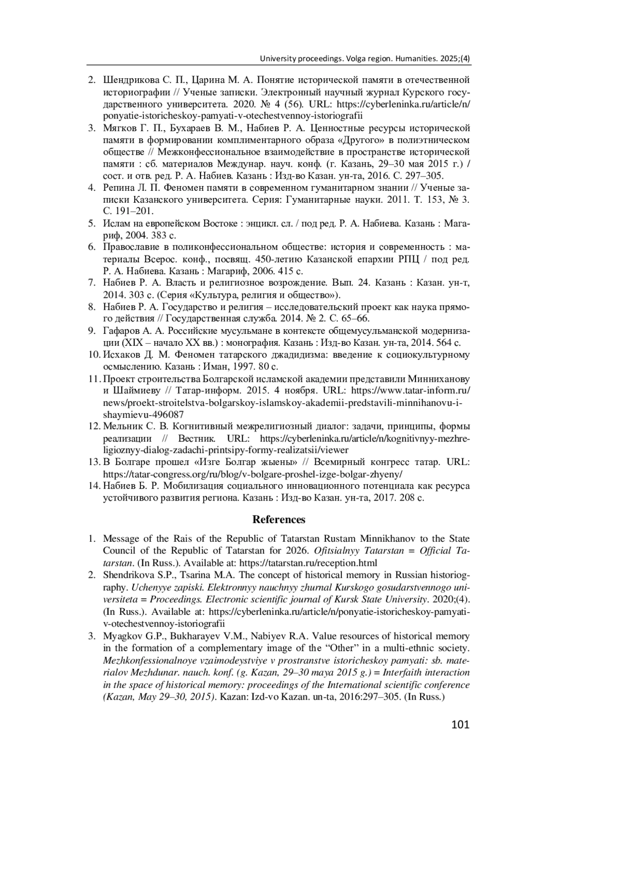 3. Мягков Г. П., Бухараев В. М., Набиев Р. А. Ценностные ресурсы исторической памяти в формировании комплиментарного образа “Другого” в полиэтническом обществе // Межконфессиональное взаимодействие в пространстве исторической памяти: сб. материалов Междунар. науч. конф. (г. Казань, 29-30 мая 2015 г.) / сост. и отв. ред. Р. А. Набиев. Казань: Изд-во Казан. ун-та, 2016. С. 297-305.