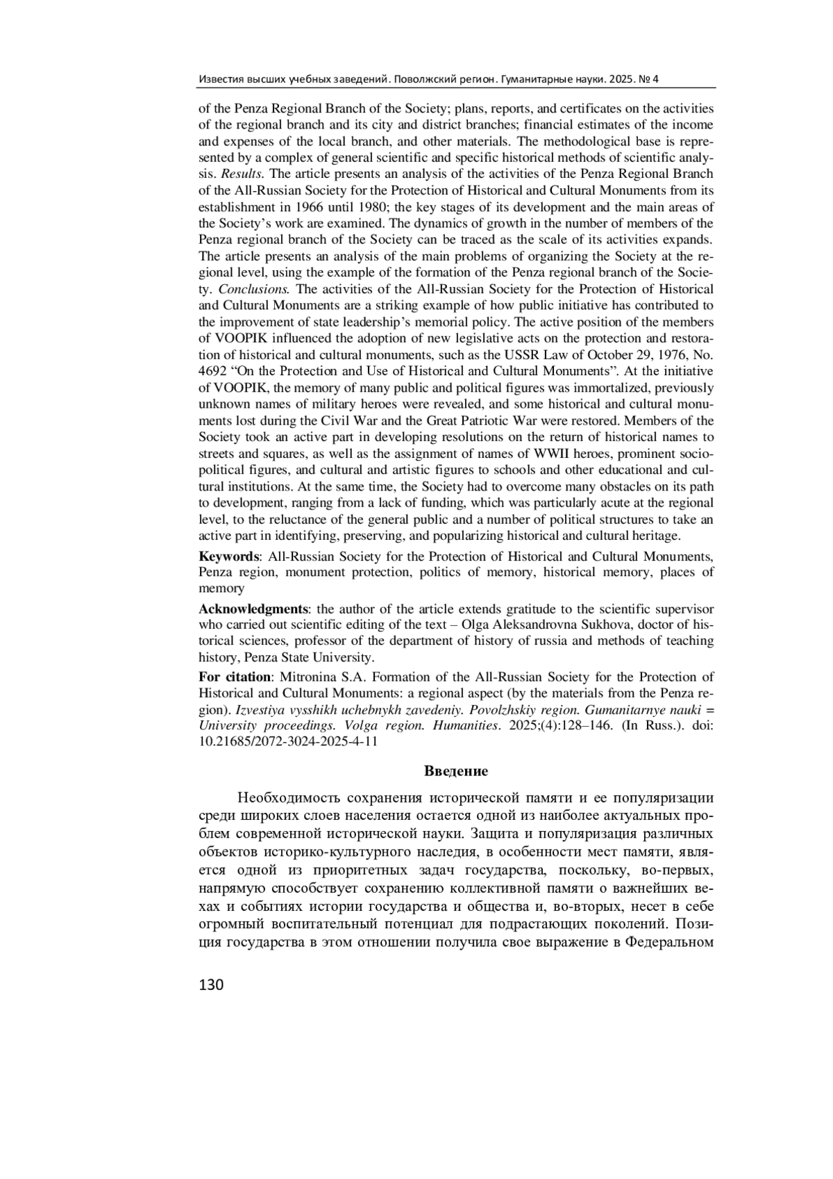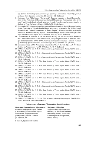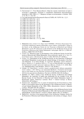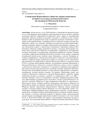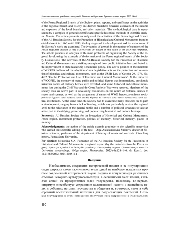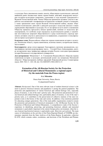 Актуальность и цели. Необходимость сохранения исторической памяти и ее популяризации среди широких слоев населения остается одной из наиболее актуальных проблем современной исторической науки. Защита и популяризация различных объектов историко-культурного наследия, в особенности мест памяти, является одной из приоритетных задач государства, поскольку способствует сохранению коллективной памяти о важнейших вехах и событиях истории государства и общества и, кроме того, обладает огромным потенциалом для воспитания подрастающих поколений. Одной из основных общественных организаций, созданных с целью обеспечения защиты и пропаганды исторических памятников, является Всероссийское общество охраны памятников истории и культуры. Всестороннее изучение опыта деятельности Общества по выявлению, сохранению и популяризации историко-культурных и мемориальных памятников приобретает большое значение в условиях современной внешнеполитической ситуации, когда вопрос сохранения исторической памяти встает особенно остро. Материалы и методы. Основным источником информации о деятельности Пензенского областного отделения Всероссийского общества охраны памятников истории и культуры служат документальные материалы Государственного архива Пензенской области, в частности фонд Р-2470, в котором представлены приказы, постановления, решения Президиума и Пленума Пензенского областного отделения Общества; планы, отчеты и справки о деятельности областного отделения и его городских и районных ячеек; финансовые сметы доходов и расходов местного отделения и прочие материалы. Методологическая база исследования включает в себя комплекс общенаучных и конкретно-исторических методов научного анализа. Результаты. Представлен анализ деятельности Пензенского областного отделения Всероссийского общества охраны памятников истории и культуры с момента его учреждения в 1966 г. до 1980 г.; изучены ключевые этапы его становления и основные направления работы Общества. Прослеживается динамика роста численного состава членов Пензенского областного отделения Общества по мере расширения масштабов его деятельности. Представлен анализ основных проблем организации деятельности Общества на региональном уровне на примере становления Пензенского областного отделения Общества. Выводы. Деятельность Всероссийского общества охраны памятников истории и культуры является ярким примером того, как инициатива «снизу» способствовала совершенствованию курса мемориальной политики государственного руководства. Активная позиция членов Всероссийского общества охраны памятников истории и культуры оказывала влияние на принятие новых законодательных актов об охране и реставрации памятников истории и культуры, в том числе Закона СССР от 29.10.1976 № 4692 «Об охране и использовании памятников истории и культуры». По инициативе Всероссийского общества охраны памятников истории и культуры была увековечена память многих общественно-политических деятелей, выявлены ранее неизвестные имена героев боевых действий, возрождены некоторые историко-культурные памятники, утраченные в годы ведения Гражданской и Великой Отечественной войн. Члены Общества принимали активное участие в выработке постановлений о возвращении исторических названий улицам и площадям, 