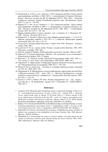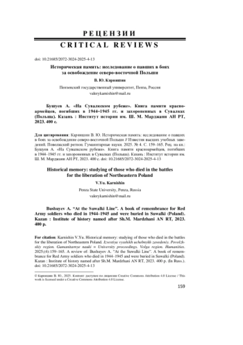 15. Репинецкий А. В. Рец. на кн.: Бушуев А. “На Сувалкском рубеже”. Книга памяти красноармейцев, погибших в 1944-1945 гг. и захороненных в Сувалках (Польша). Казань: Институт истории им. Ш. М. Марджани АН РТ, 2023. 400 с. // Известия Самарского научного центра Российской академии наук. Исторические науки. 2024. Т. 6, № 3. С. 155-158.