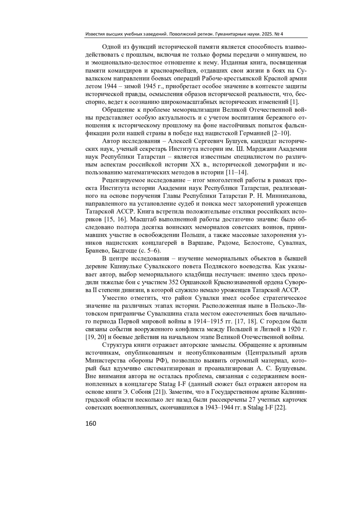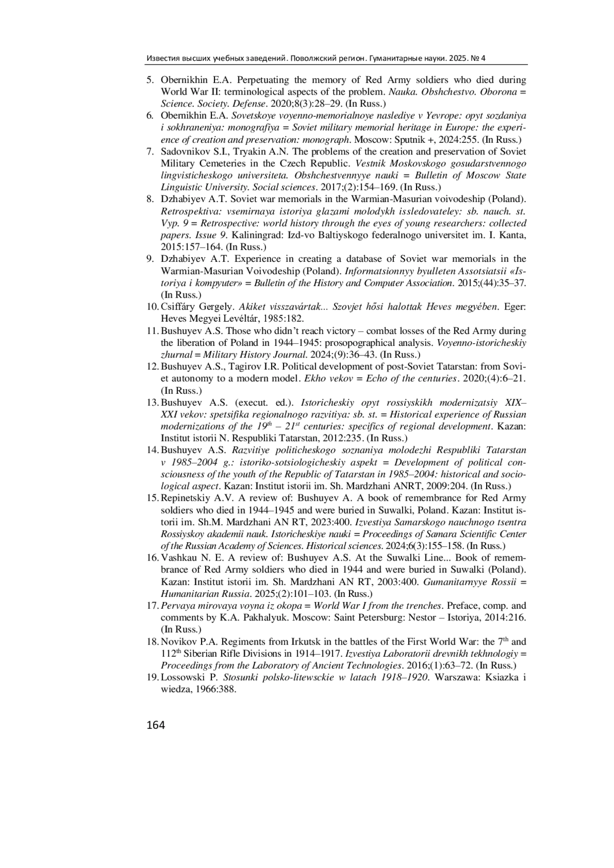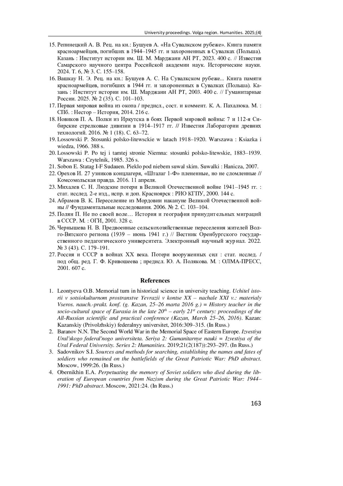16. Вашкау Н. Э. Рец. на кн.: Бушуев А. С. На Сувалкском рубеже.. Книга памяти красноармейцев, погибших в 1944 гг. и захороненных в Сувалках (Польша). Казань: Институт истории им. Ш. Марджани АН РТ, 2003. 400 с. // Гуманитарные России. 2025. № 2 (35). С. 101-103.