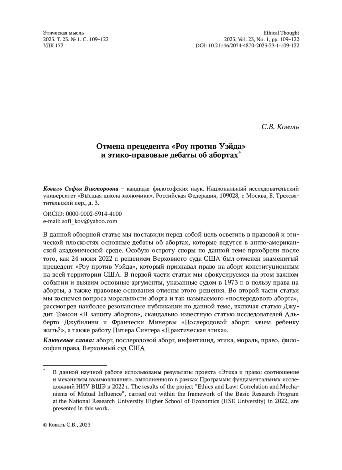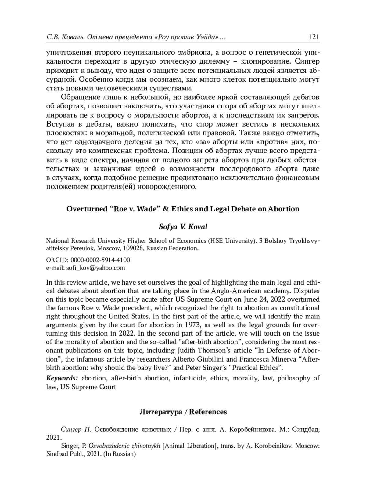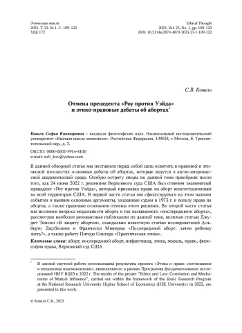 В данной обзорной статье мы поставили перед собой цель осветить в правовой и этической плоскостях основные дебаты об абортах, которые ведутся в англо-американской академической среде. Особую остроту споры по данной теме приобрели после того, как 24 июня 2022 г. решением Верховного суда США был отменен знаменитый прецедент «Роу против Уэйда», который признавал право на аборт конституционным на всей территории США. В первой части статьи мы сфокусируемся на этом важном событии и выявим основные аргументы, указанные судом в 1973 г. в пользу права на аборты, а также правовые основания отмены этого решения. Во второй части статьи мы коснемся вопроса моральности аборта и так называемого «послеродового аборта», рассмотрев наиболее резонансные публикации по данной теме, включая статью Джудит Томсон «В защиту абортов», скандально известную статью исследователей Альберто Джубилини и Франчески Минервы «Послеродовой аборт: зачем ребенку жить?», а также работу Питера Сингера «Практическая этика».