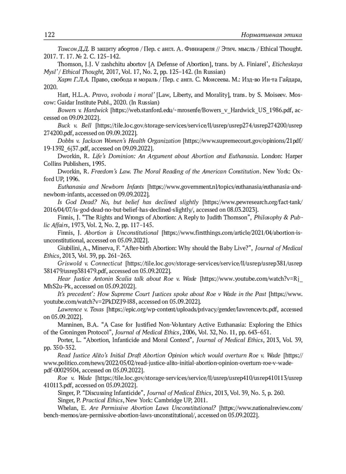 4. Thomson, J.J. V zashchitu abortov [A Defense of Abortion], trans. by A. Finiarel’, Eticheskaya Mysl’ / Ethical Thought, 2017, Vol. 17, No. 2, pp. 125-142. (In Russian). EDN: YOEFEM