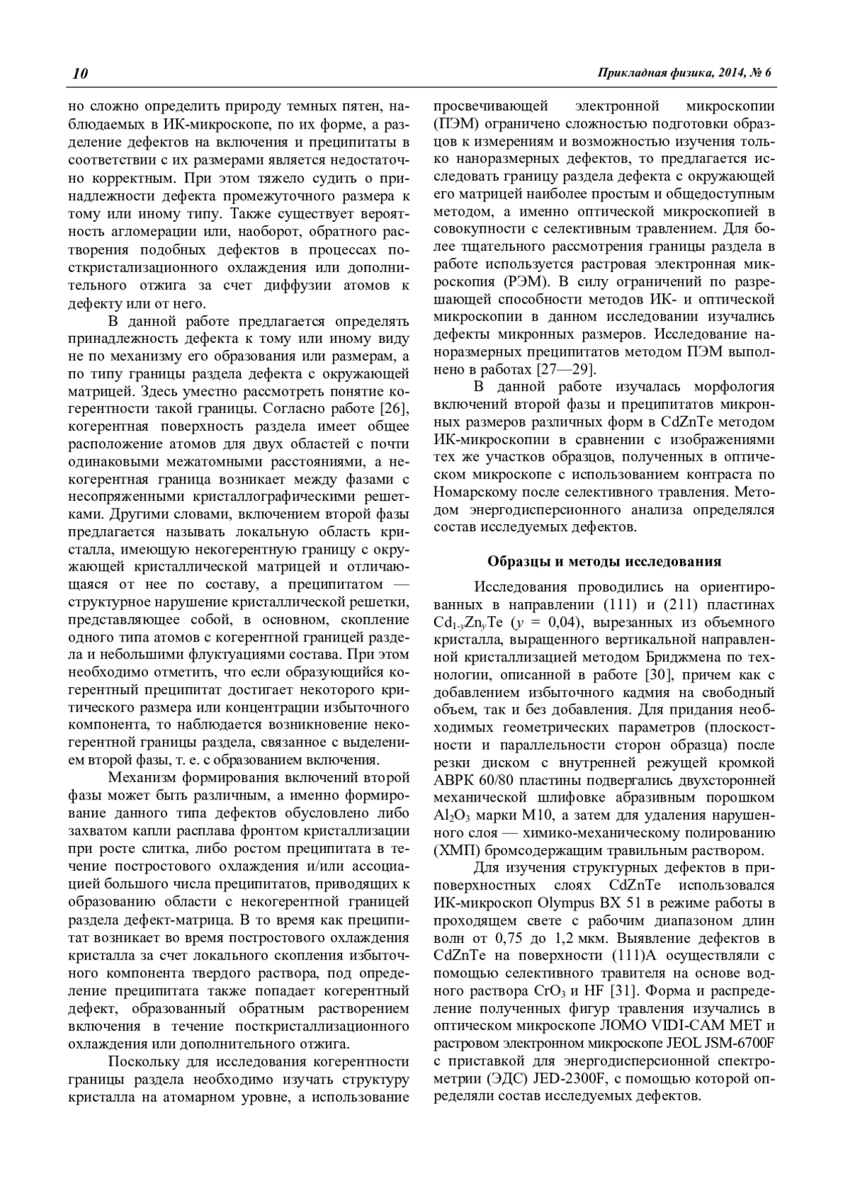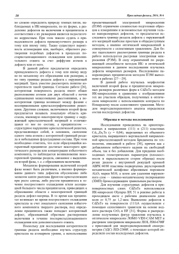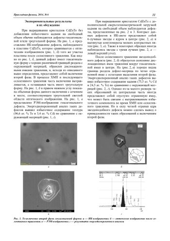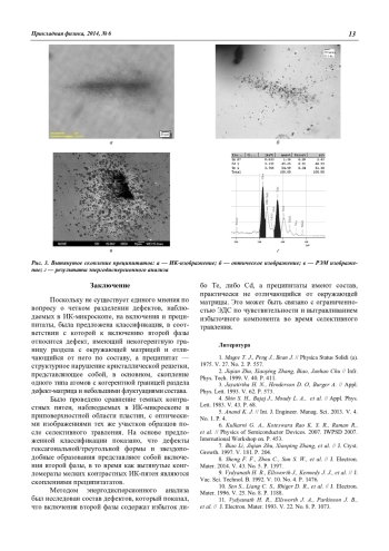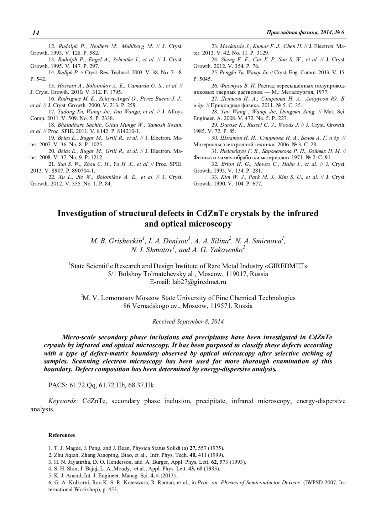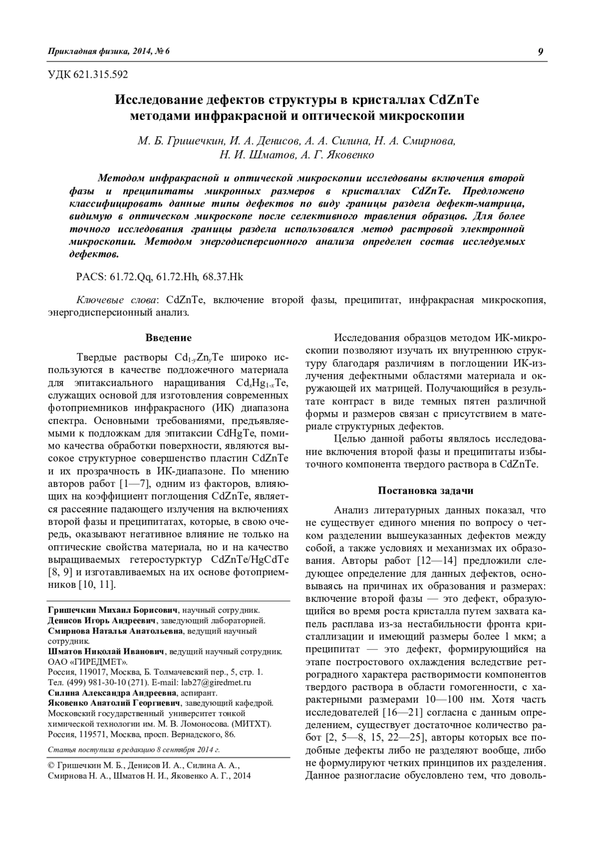 Гришечкин М. Б., Денисов И. А., Силина А. А., Смирнова Н. А., Шматов Н. И., Яковенко А. Г. Исследование дефектов структуры в кристаллах CdZnTe методами инфракрасной и оптической микроскопии 9
